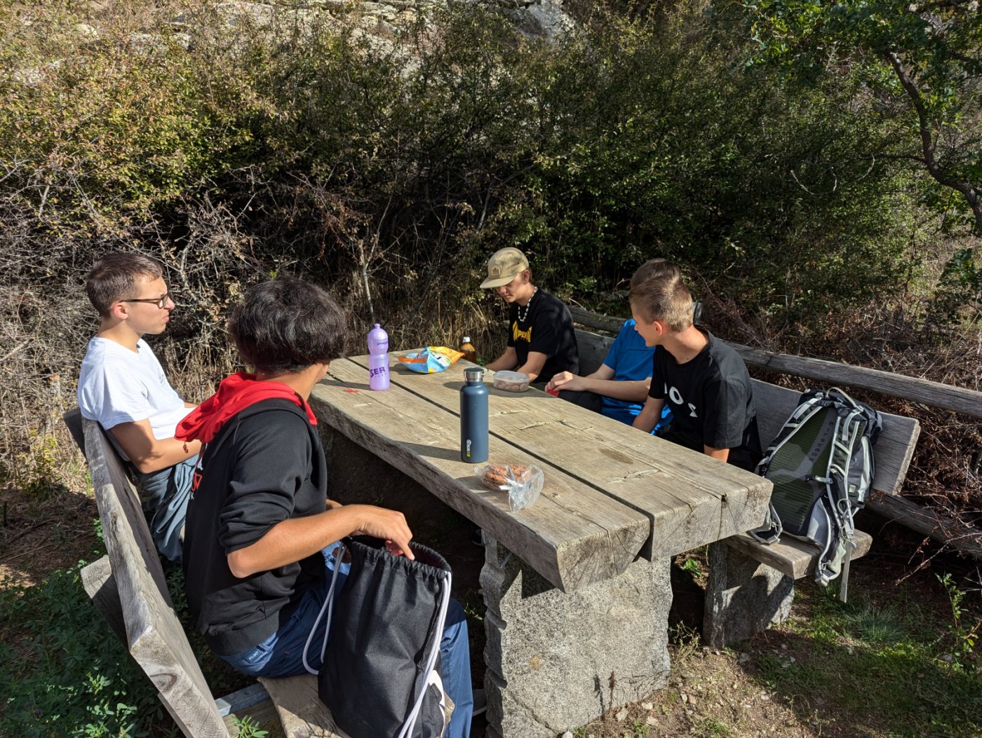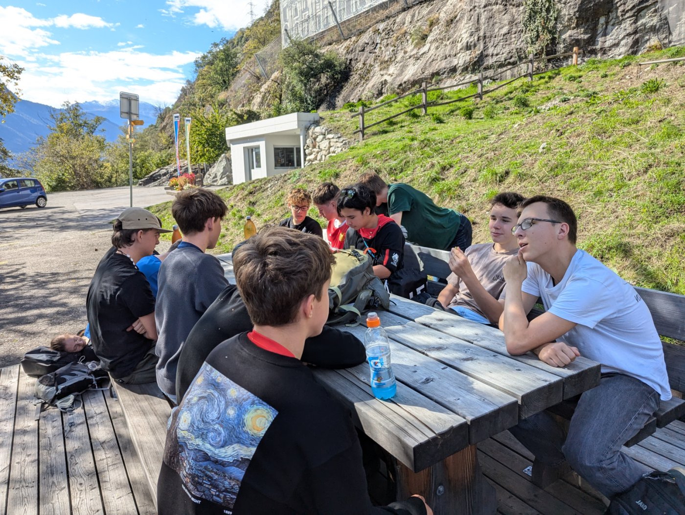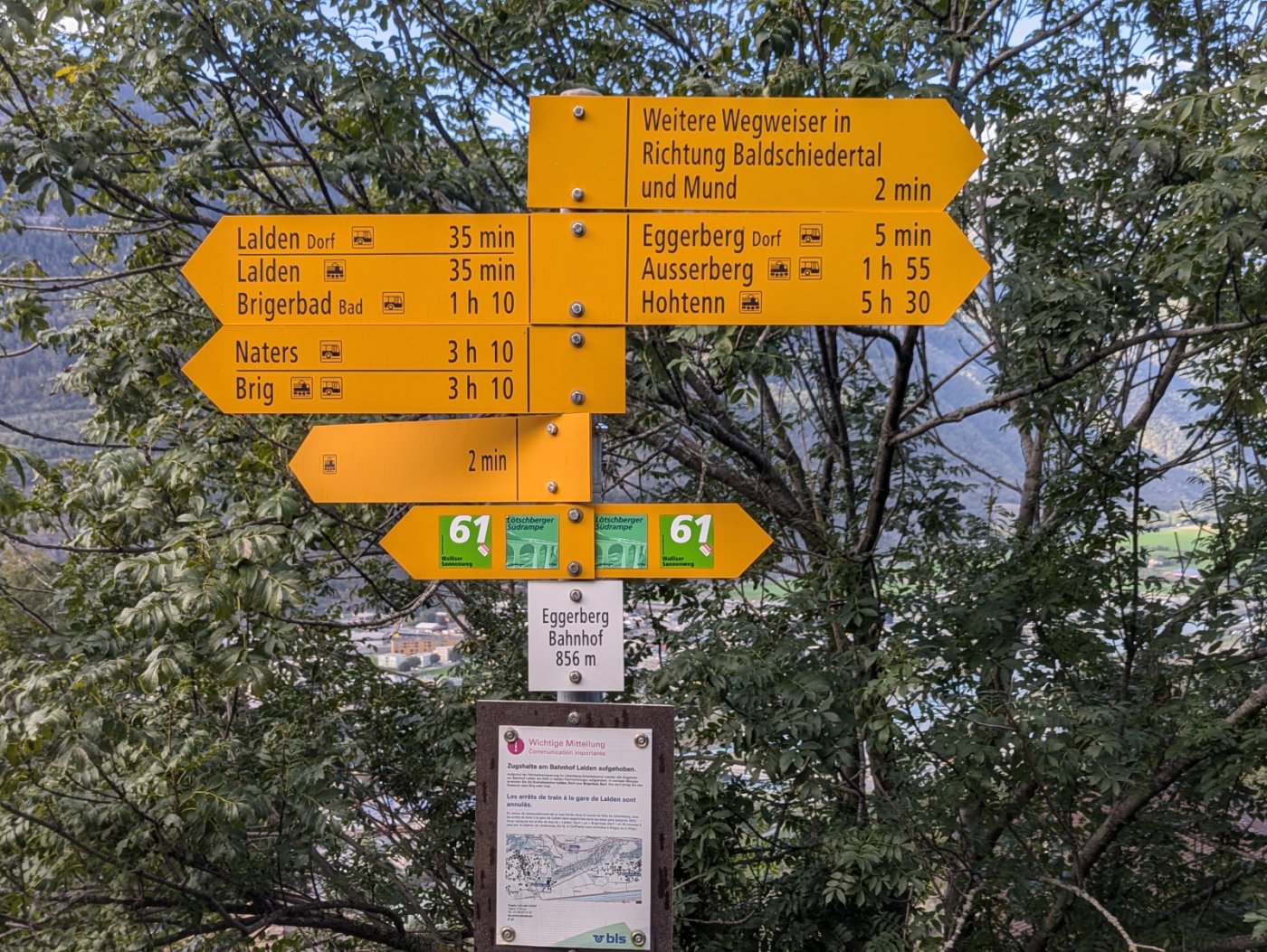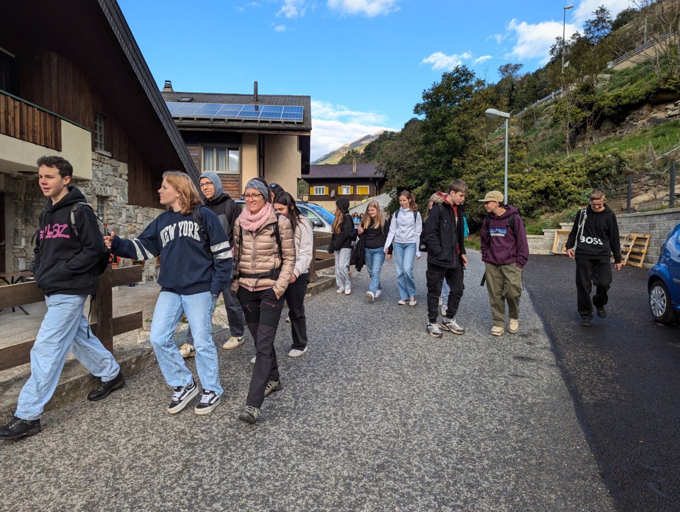 Wir haben uns am Bahnhof in Brig um 9:25 Uhr getroffen. Dann wir sind mit dem Zug nach Eggerberg gefahren. Gestern war schönes Wetter. Wir gingen einen kleinen Weg entlang. Nach einer Stunde haben wir gegessen. Wir assen in kleinen Gruppen die Sandwiches, die wir zu Hause vorbereiten sollten. Eine Gruppe von 6 Personen hat sich verirrt. Die anderen warteten eine Stunde auf sie. Der Spaziergang war 11km lang. Wir sollten drei Stunden laufen, aber die, die sich verlaufen hatten, sind vier Stunden gelaufen.