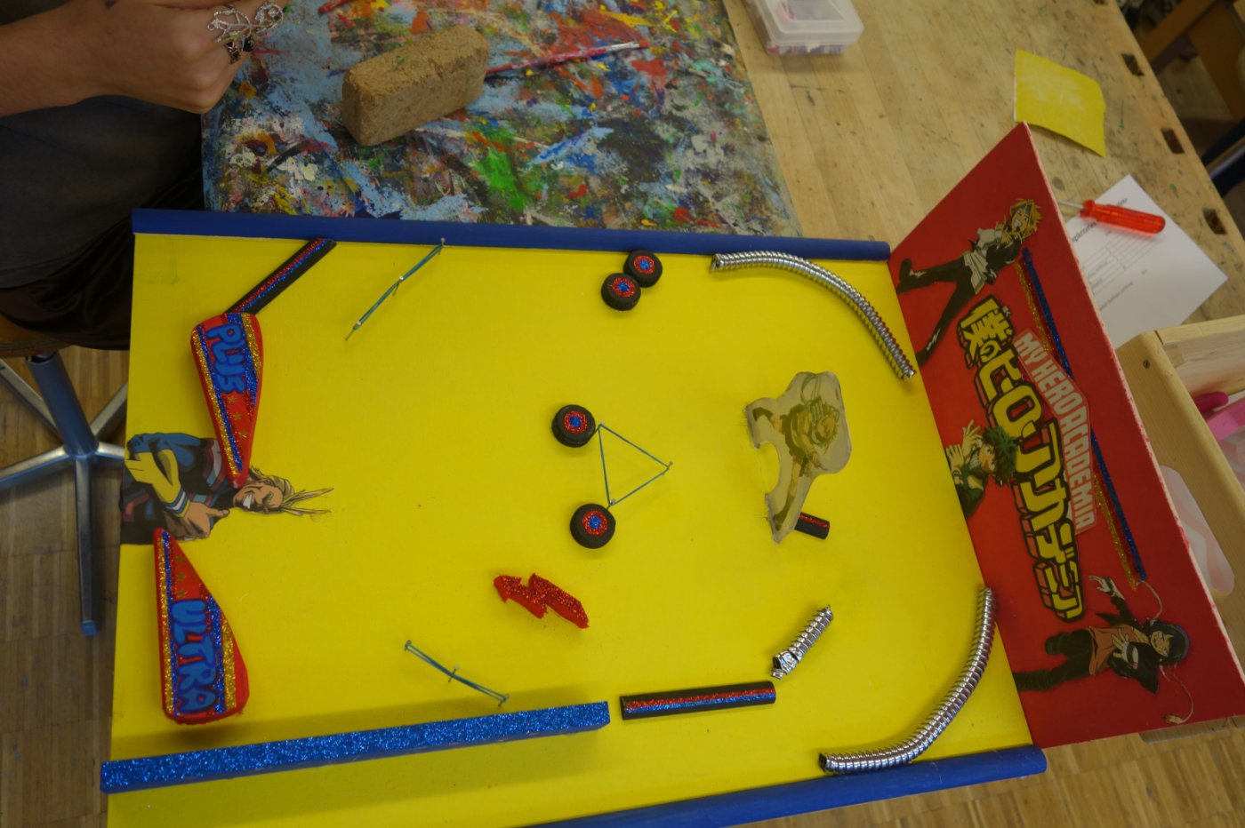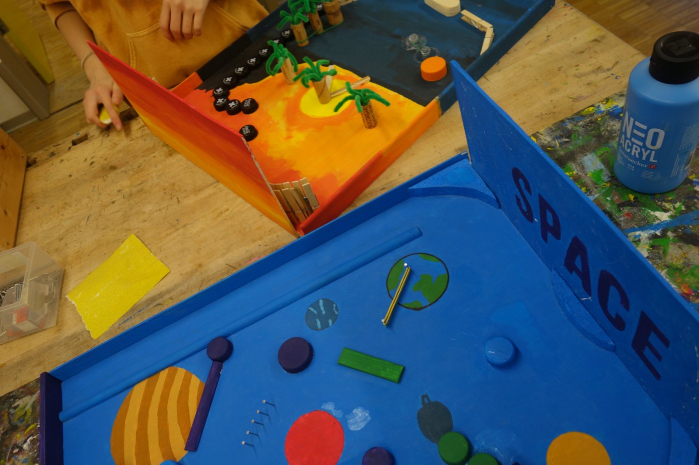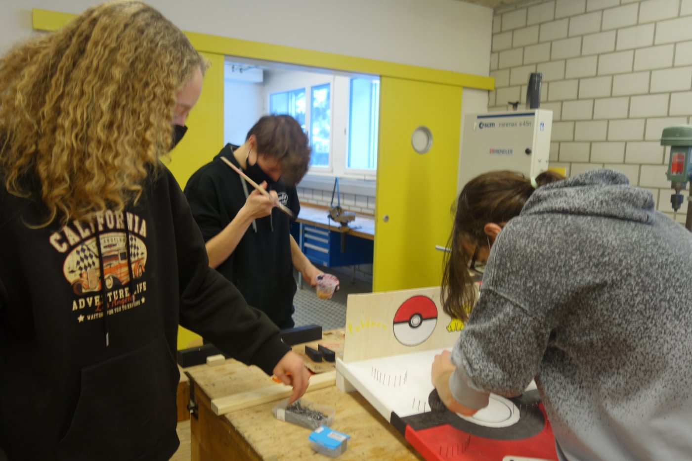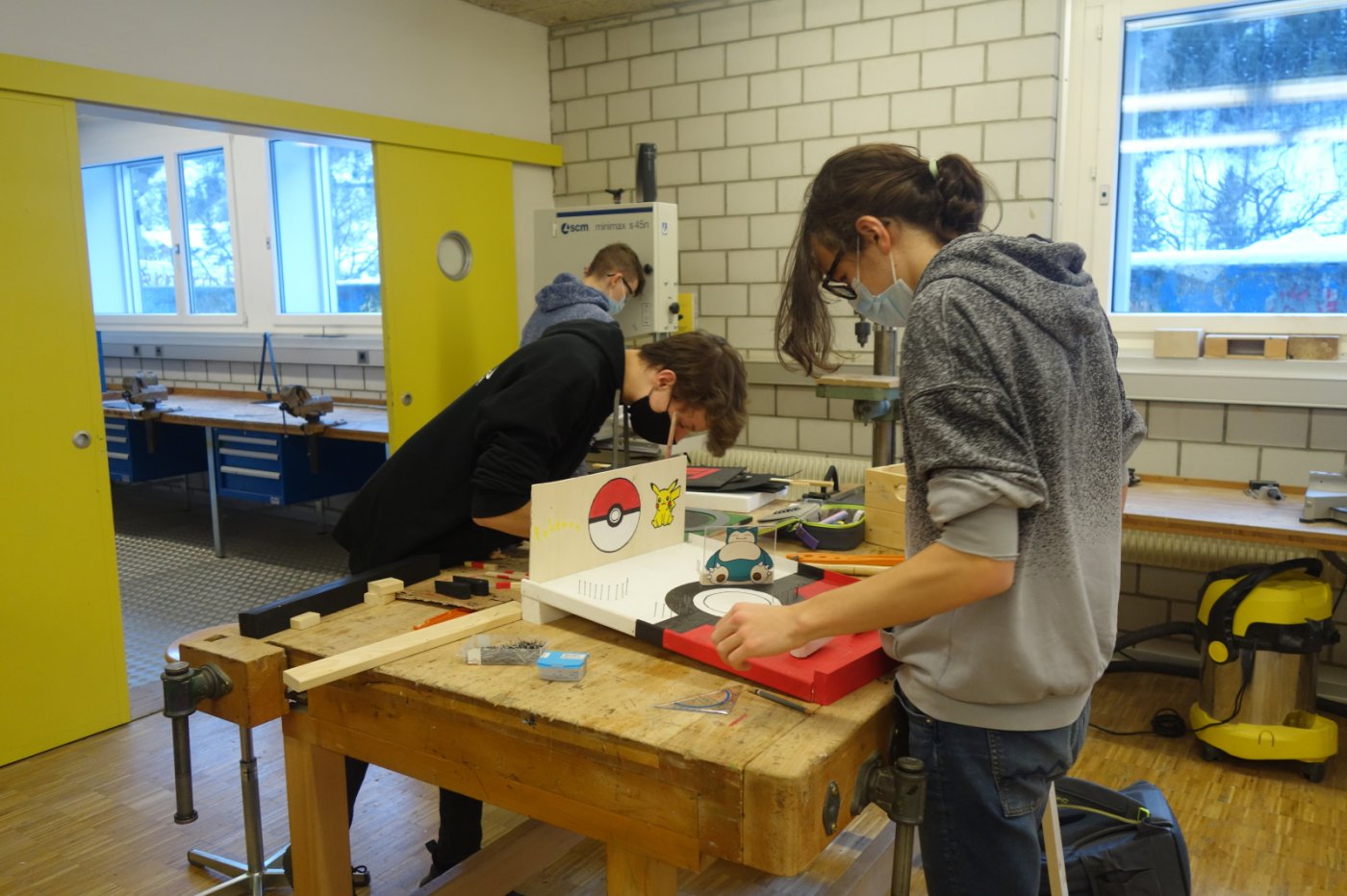 Die 2. OS hat im ersten Semester Werken einen Flipperkasten erarbeitet. Am Anfang mussten wir uns ein Motiv ausdenken. Da gab es schon die ersten ausgefallenen Ideen: von Autos, Idolen, Tieren, Sport bis hin zu Barbie. Wir mussten dann viel Holz ausmessen und bearbeiten. Dabei gingen einige Sägen mitsamt unseren Hoffnungen kaputt. Nichtsdestotrotz haben wir durchgebissen und uns ins Projekt reingekniet - bis wir einen Ball herstellen sollten. Dies schien in der Theorie einfacher als es tatsächlich war, weshalb einige am nächsten Tag im "Giro" fertige Holzbälle kaufen gingen. Leider ist dieser Trick – wen wundert's - in der nächsten Lektion aufgeflogen. Als «Strafe» mussten wir nochmals einen neuen Ball herstellen, welcher auch bewertet wurde. Langsam nahmen die Flipperkästen Gestalt an. Einige wurden unfreiwillig mit Glitzersteinen übersäht. Wir liessen der Kreativität freien Lauf. Alles in allem war es ein sehr interessantes Projekt, welches allen viel Spass bereitet hat. Die Flipperkästen können sich sehen lassen und sind zum Glück auch funktionstüchtig!
