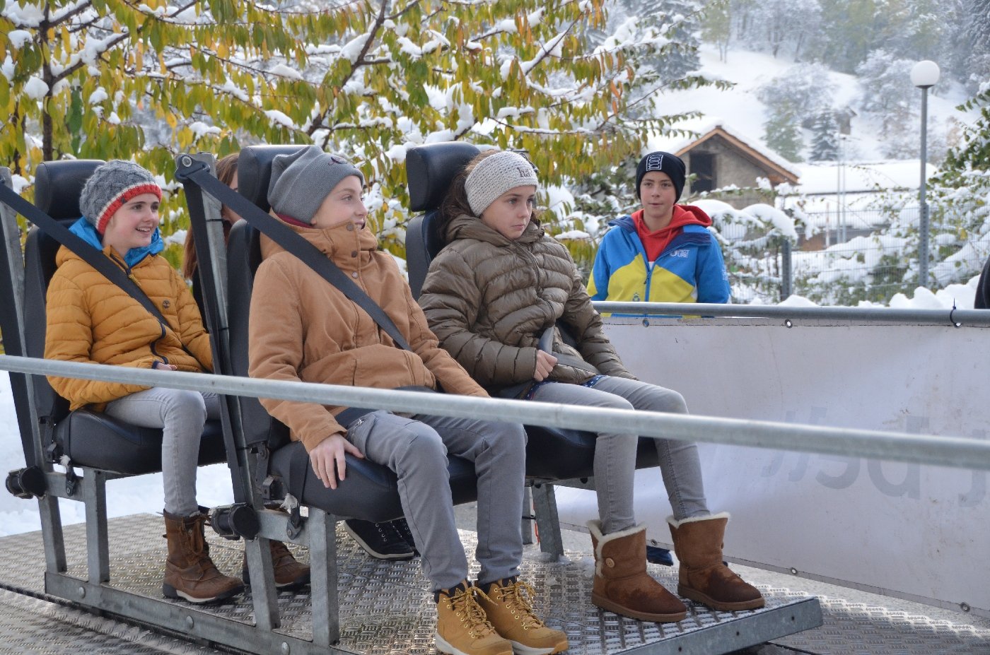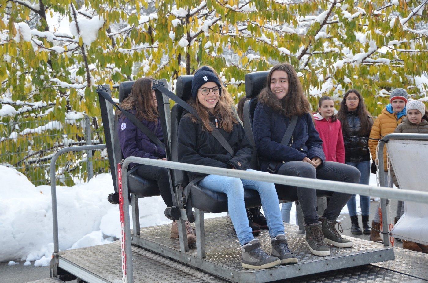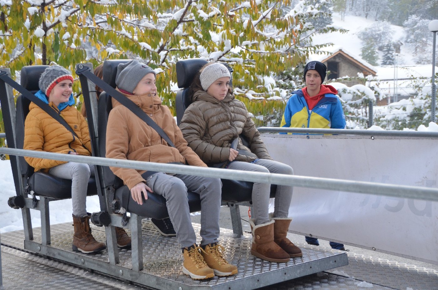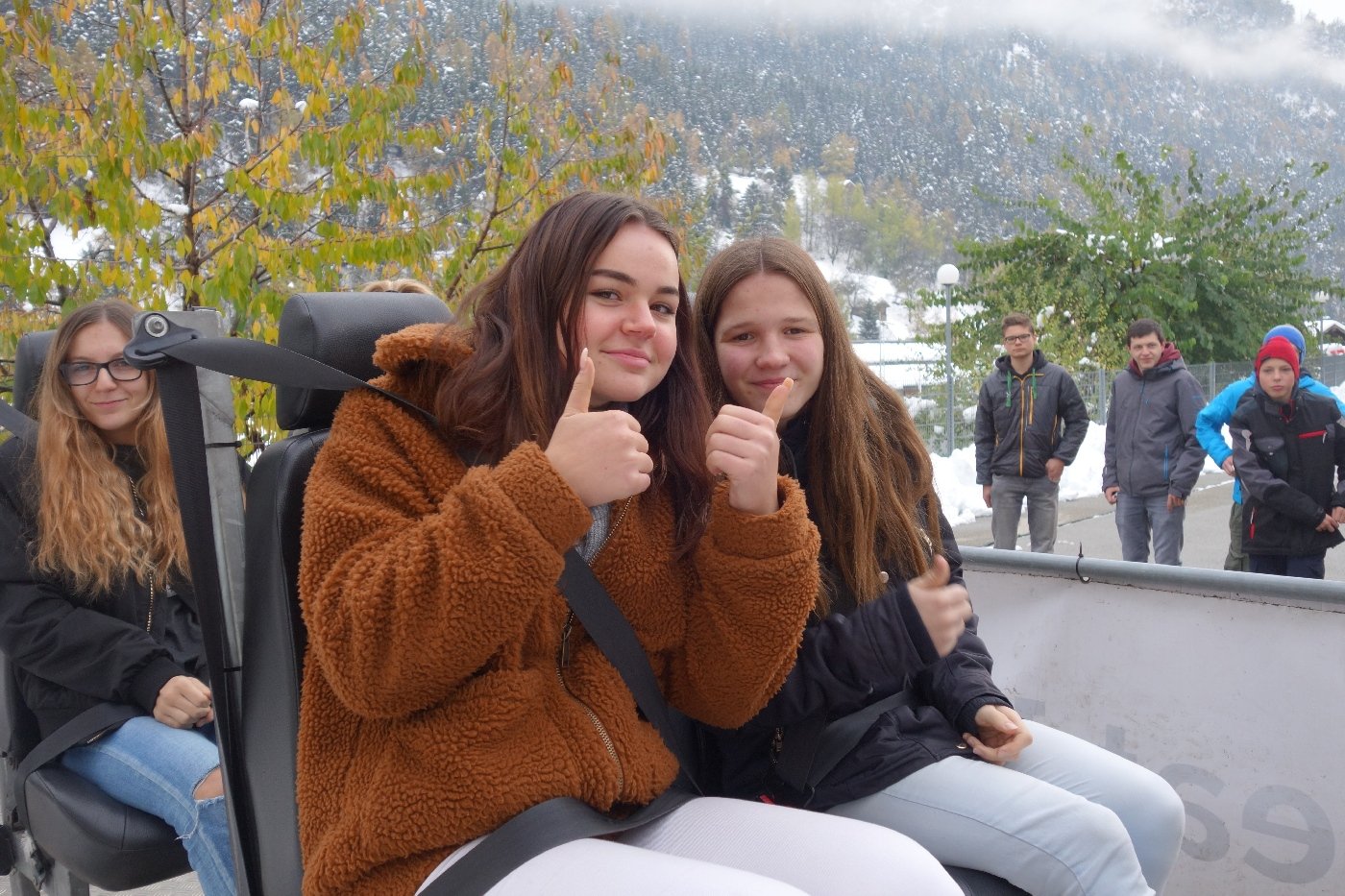 Die Gemeindepolizei Naters informierte die OS-Klassen anschaulich, dass ein kleiner "Klick" oftmals ein Leben retten kann und es fahrlässig ist, dies nicht zu tun. Die Funktion der Gurte konnten die Jugendlichen anschliessend am eigenen Leib erfahren, als auf einem Schlitten mit knapp 8 km/h eine Vollbremsung simuliert wurde.