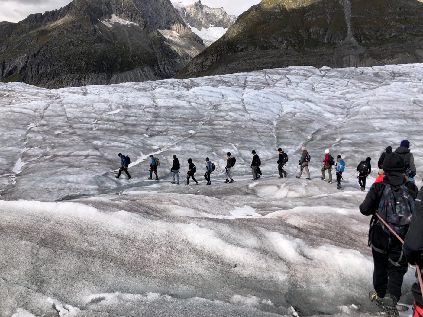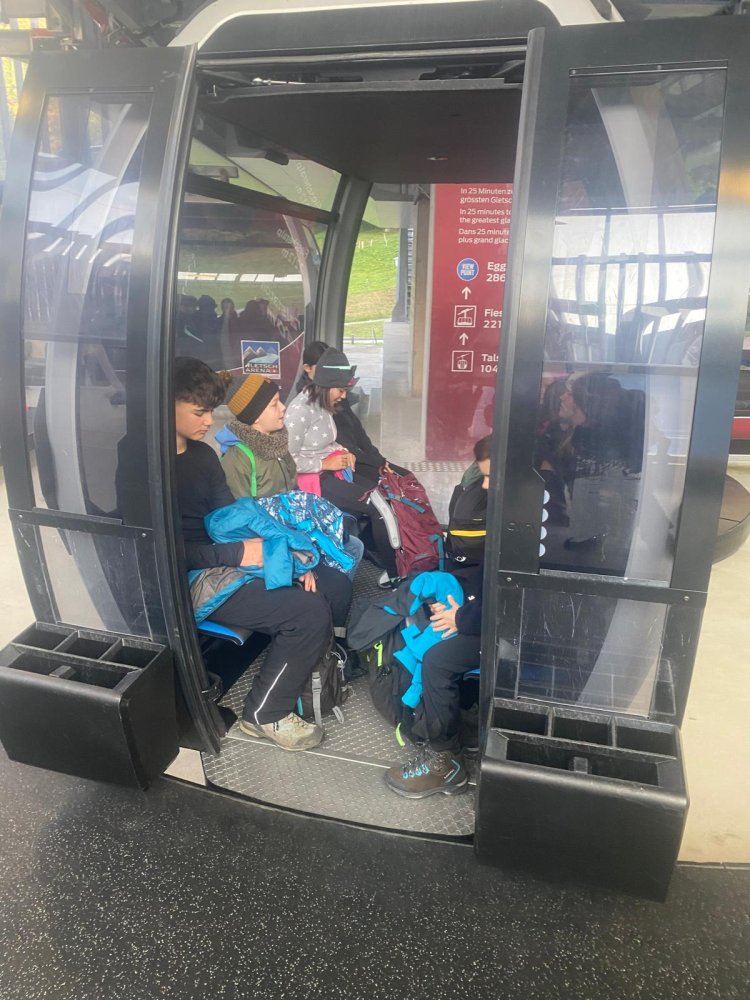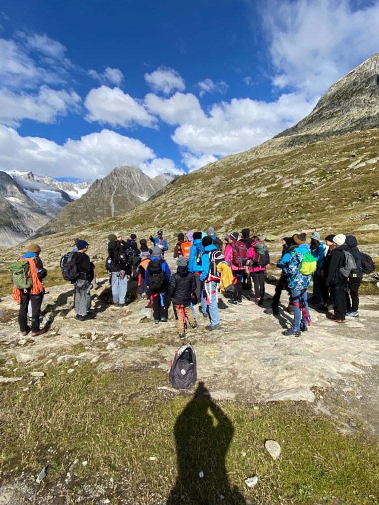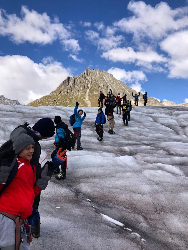 Mit einem für die Mädchen zu engem Zeitplan, ging es zur Talstation Fiescheralp. Unten empfingen uns Ivan und Reinhard. Nach einem gemütlichen Spaziergang begaben wir uns zur Gletscherstube. Über Stein und Wasser ging es zum Gletscher. Dann montierten wir merkwürdige Zacken, sogenannte Steigeisen. Über eine instabile Leiter wagten wir uns an den Gletscher heran. Am Anfang waren wir noch konzentriert, doch nach zwei Stunden liess die Konzentration zu wünschen übrig. Zurück in der Gletscherstube machten wir eine Klassenchallenge. Beide Klassen haben sich gut geschlagen und haben einander unterstützt. Doch wer war der wahre Sieger? Das müsst ihr nicht wissen…