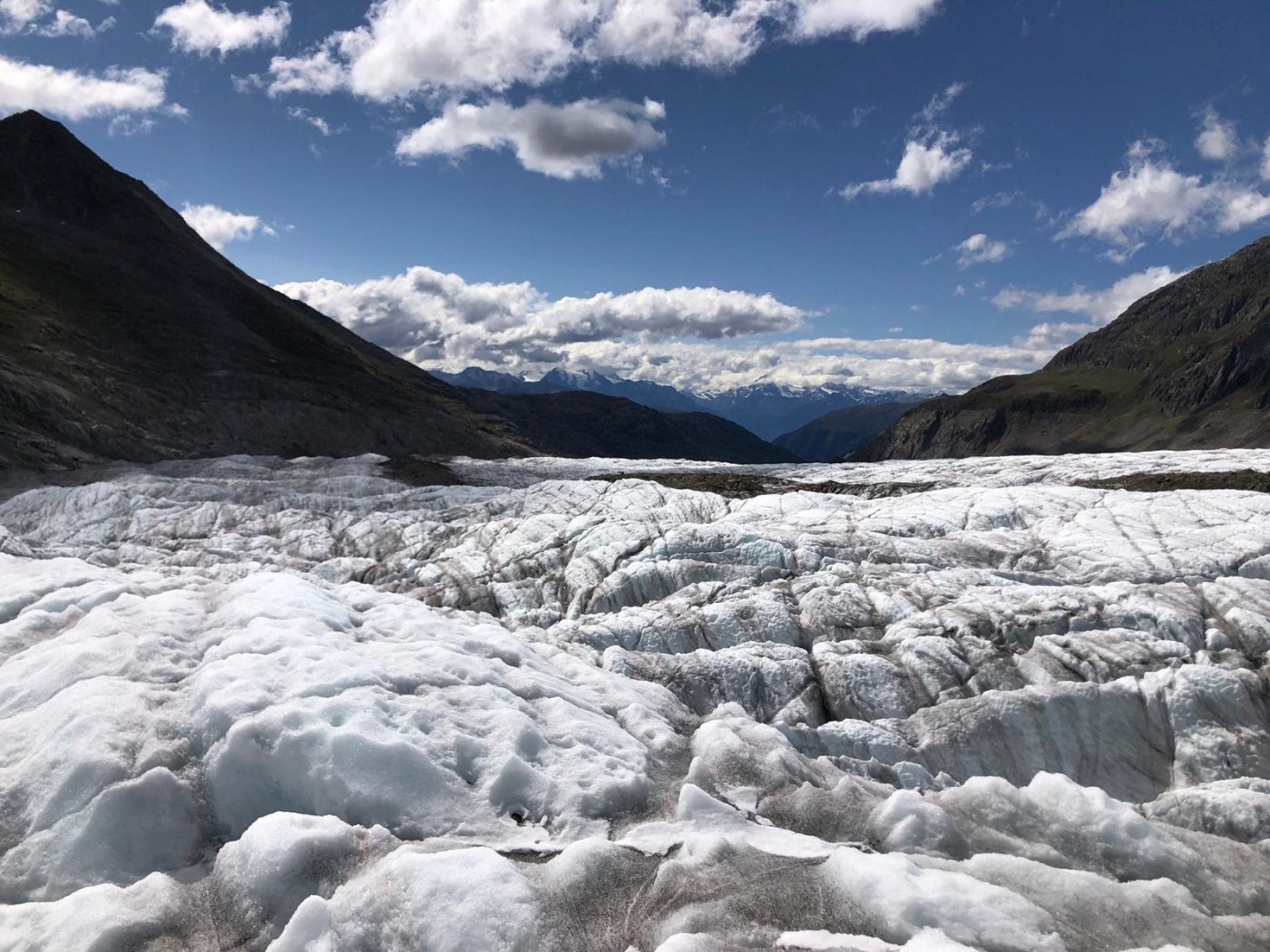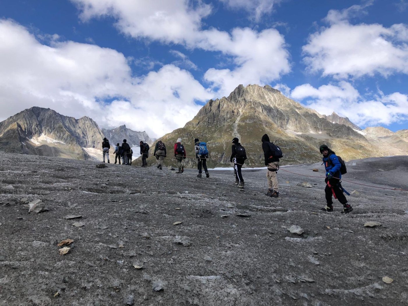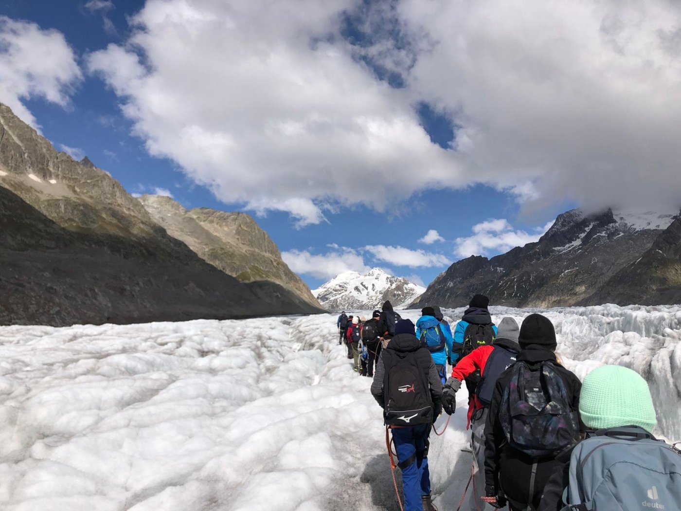 Mit einem für die Mädchen zu engem Zeitplan, ging es zur Talstation Fiescheralp. Unten empfingen uns Ivan und Reinhard. Nach einem gemütlichen Spaziergang begaben wir uns zur Gletscherstube. Über Stein und Wasser ging es zum Gletscher. Dann montierten wir merkwürdige Zacken, sogenannte Steigeisen. Über eine instabile Leiter wagten wir uns an den Gletscher heran. Am Anfang waren wir noch konzentriert, doch nach zwei Stunden liess die Konzentration zu wünschen übrig. Zurück in der Gletscherstube machten wir eine Klassenchallenge. Beide Klassen haben sich gut geschlagen und haben einander unterstützt. Doch wer war der wahre Sieger? Das müsst ihr nicht wissen…