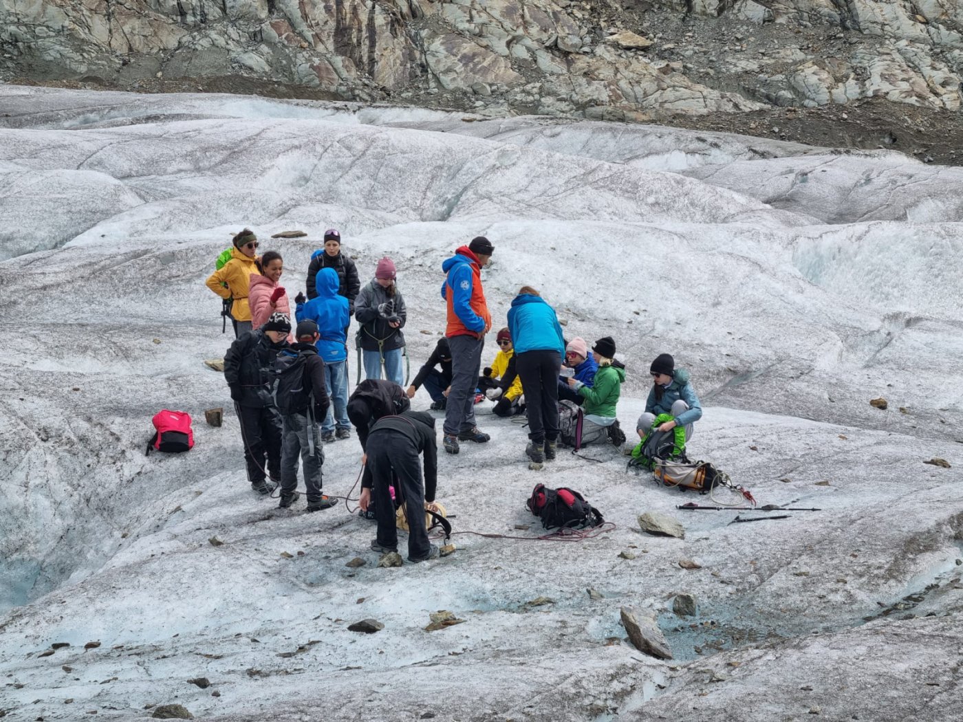 Am Dienstagmorgen gings mit teils verschlafenen Gesichtern früh los auf die Aletschgletscher-Tour. Beim Frühstuck durften wir selbstständig unsere Sandwiches fürs Mittagessen streichen. Wir liefen zur Moosfluh und gingen mit den Gondeln hoch, danach liefen wir mit unseren Begleiterinnen in Richtung Aletschgletscher. Dann trafen wir unsere Bergführer kurz vor dem Aletschgletscher. Bevor wir zum Gletscher wanderten, machten wir eine kurze Mittagspause. Dann war es endlich soweit und wir durften mit den «Spikes» an den Sohlen auf den Gletscher gehen. Während der Tour entdeckten wir Gletscherflöhe, welche teilweise sogar umhersprangen, wir sahen Gletschertische und tranken von der Gletschermilch. Die Bergführer und Begleiterinnen von ProNatura erzählten uns sehr viel über den Gletscher. Dadurch verging die Zeit leider wie im Flug und unsere Gletschertour war bereits vorbei. Nach einer weiteren Pause machten wir uns für den langen Anstieg zur Villa Cassel bereit. Jetzt freuen wir uns auf das Abendessen und den Filmeabend.