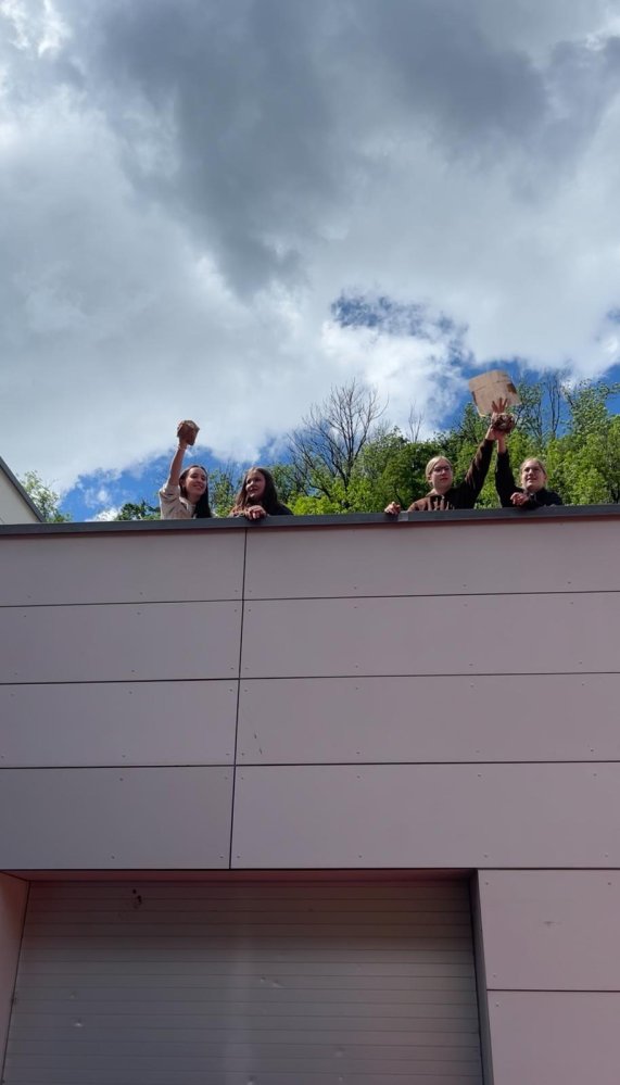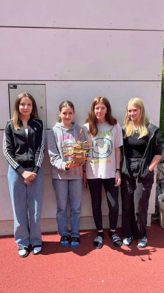 In der vergangenen Woche hat die 11OS ein spannendes Kurzprojekt mit dem Titel "Nicht fallenlassen" durchgeführt. Ziel des Projektes war es, dass die Schülerinnen und Schüler in Gruppen einen Schutz für ein rohes Ei entwerfen und bauen, sodass dieses einen Sturz aus mehreren Metern Höhe unbeschadet übersteht.