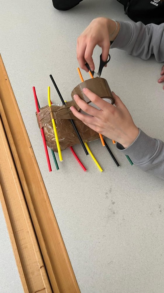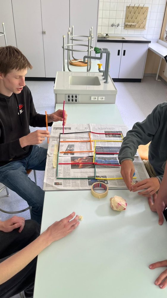 Zur Verfügung standen den Gruppen dabei nur einfache Materialien: 20 Pappstrohhalme, zwei Zeitungsblätter, Klebeband und Schnur. Trotz dieser begrenzten Ressourcen gelang es jeder Gruppe, eine Konstruktion zu erstellen, die das Ei erfolgreich vor dem Zerbrechen bewahrte.