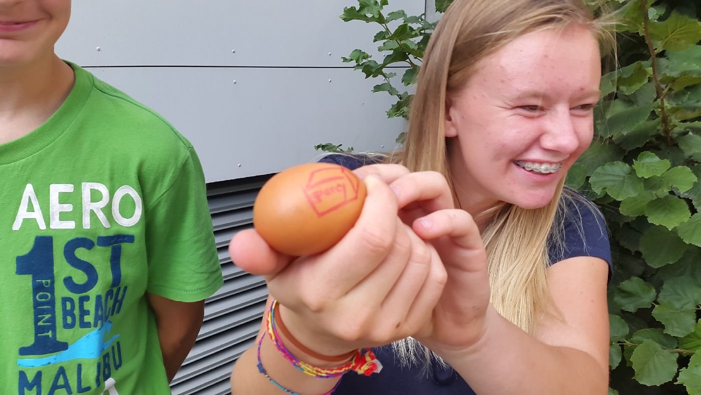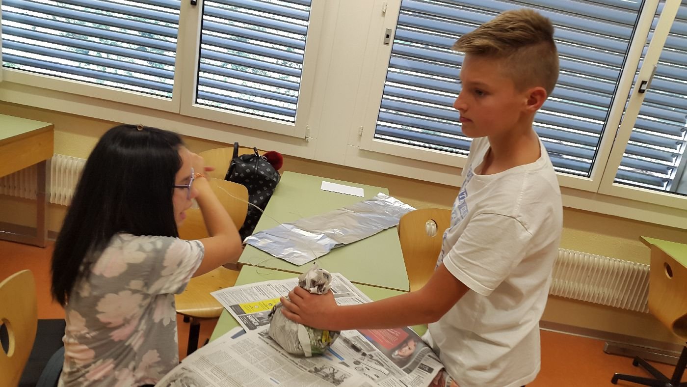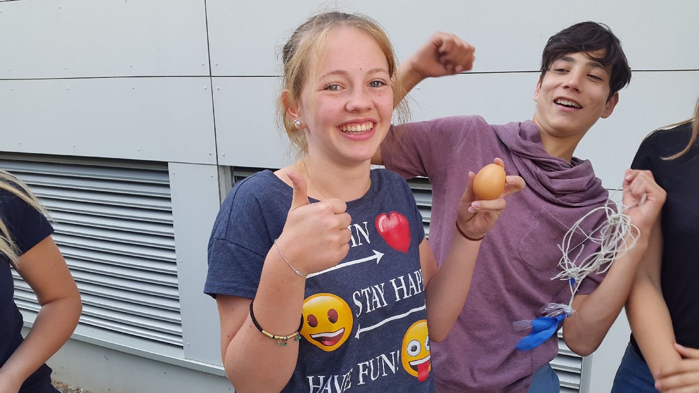 Die Jugendlichen bastelten eifrig an ihren Ei-Airbags und Fallschirmen, welche der Schwerkraft ein Schnippchen schlagen sollten. Liebevollerweise wurden manche Eier vor dem Versuch sogar "getauft". Entwarnung im Fall "Percy": er hat es geschafft und ist ganz geblieben... doch vielleicht ist er inzwischen bereits zu einem Spiegelei weiter verarbeitet und verzehrt worden.