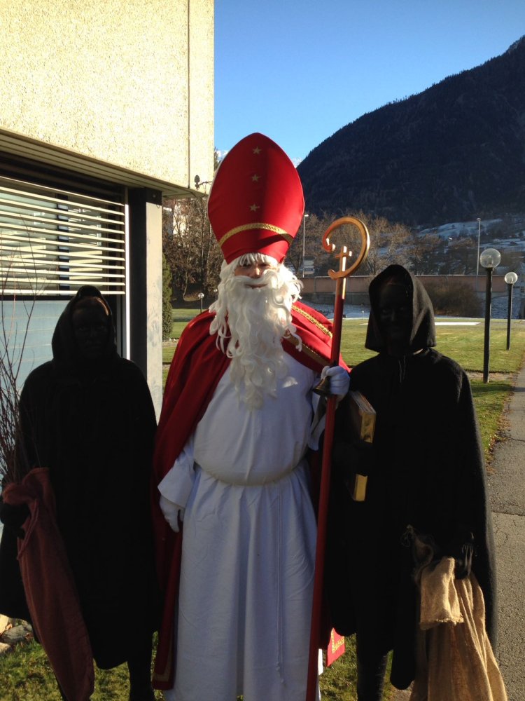 Am 6. Dezember besuchten Annalena Schalbetter und Janina Biderbost als Schmutzlis und Herr Liniger als Nikolaus die Patienten im Spital Brig. Praktisch im jedem Zimmer wurden die besten Genesungswünsche überbracht. Neben den Wünschen bekamen die Patienten auch einen kleinen Sack mit Mandarinen und Nüssen, so dass sie den Besuch sicher nicht vergessen. Am Abend ging das Trio dann auch noch zu den Seniorenturnerinnen in Glis, wo sie kurzerhand einen Übungsteil mitmachten. Leicht verschwitzt ging es noch zu einigen Familien, wo den Kindern neben wenig Tadel auch viel Lob aus dem goldenen Buch vorgelesen wurde. Am Schluss war der Sack mit den Geschenken auf jeden Fall leer, der mit den Ruten aber noch praktisch voll.