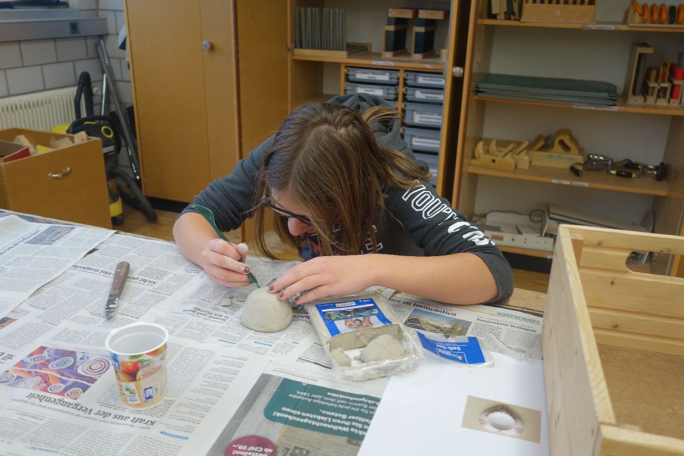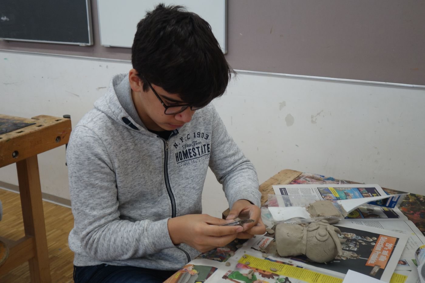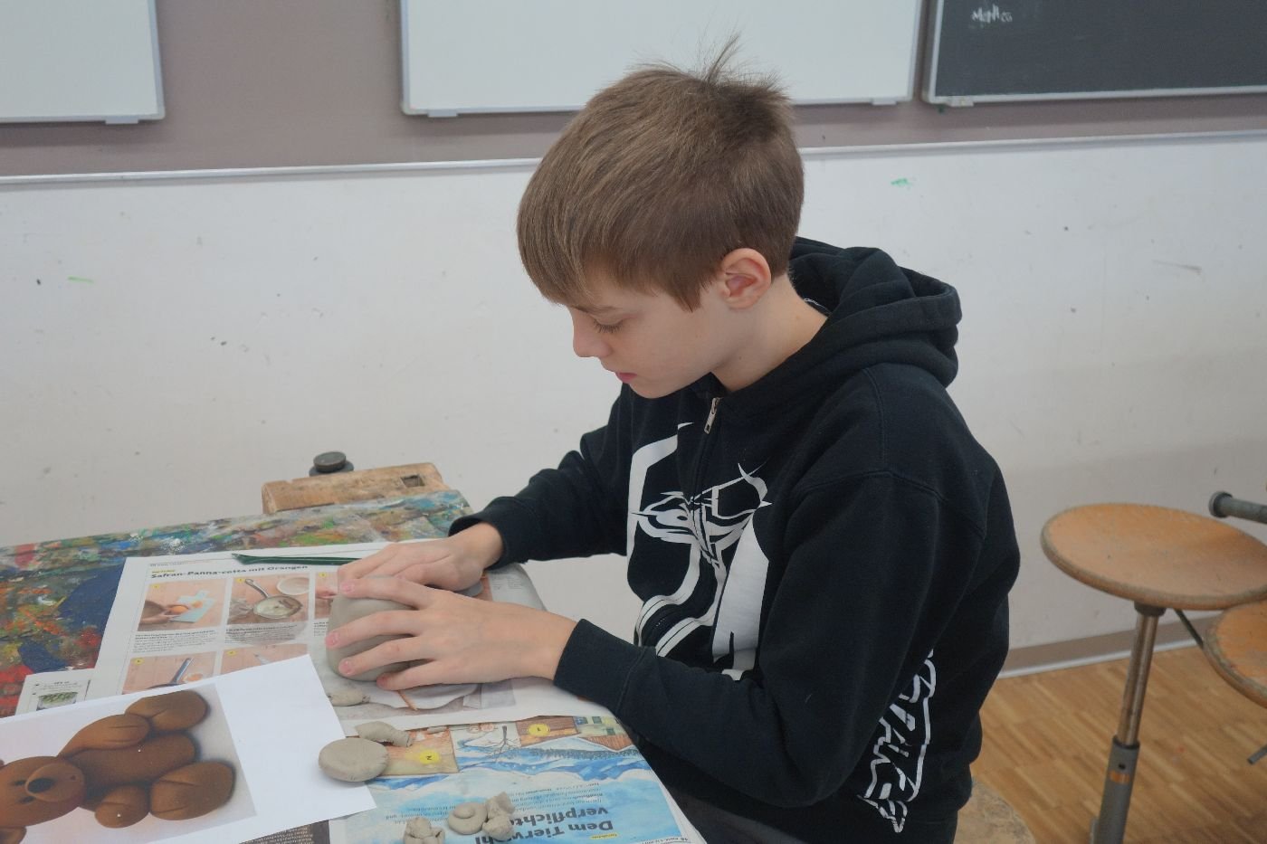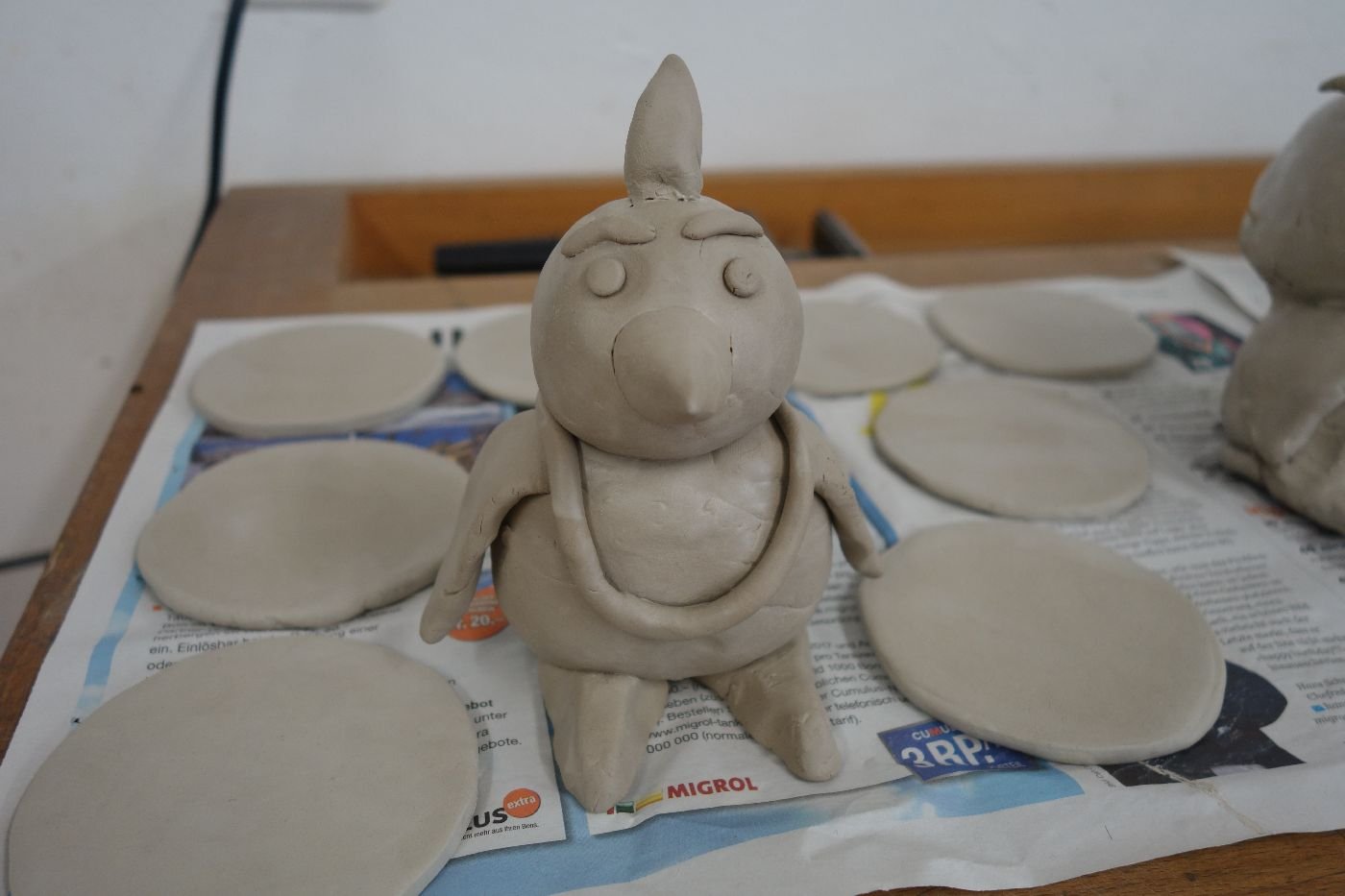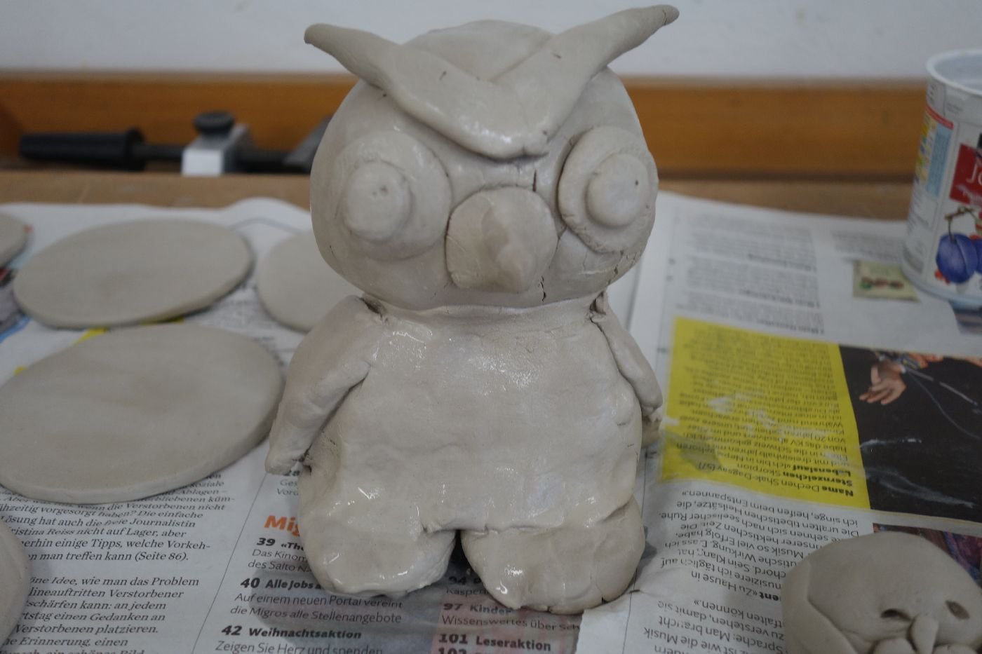 Der plastische Ton lädt zum Experimentieren mit Form und Farbe ein. Die 1. OS entdeckte die vielfältigen Gestaltungsmöglichkeiten für das Entwerfen und Herstellen von Gefässen und verschiedenen Objekten. Ziel war es, Gegenstände mit der Pinchtechnik (Daumendrucktechnik) herzustellen, die sowohl als Dekoration oder auch als Gebrauchsutensilien verwendet werden können. Tierfiguren, Untersetzer, Weihnachtsengel oder Schalen wurden kreiert.