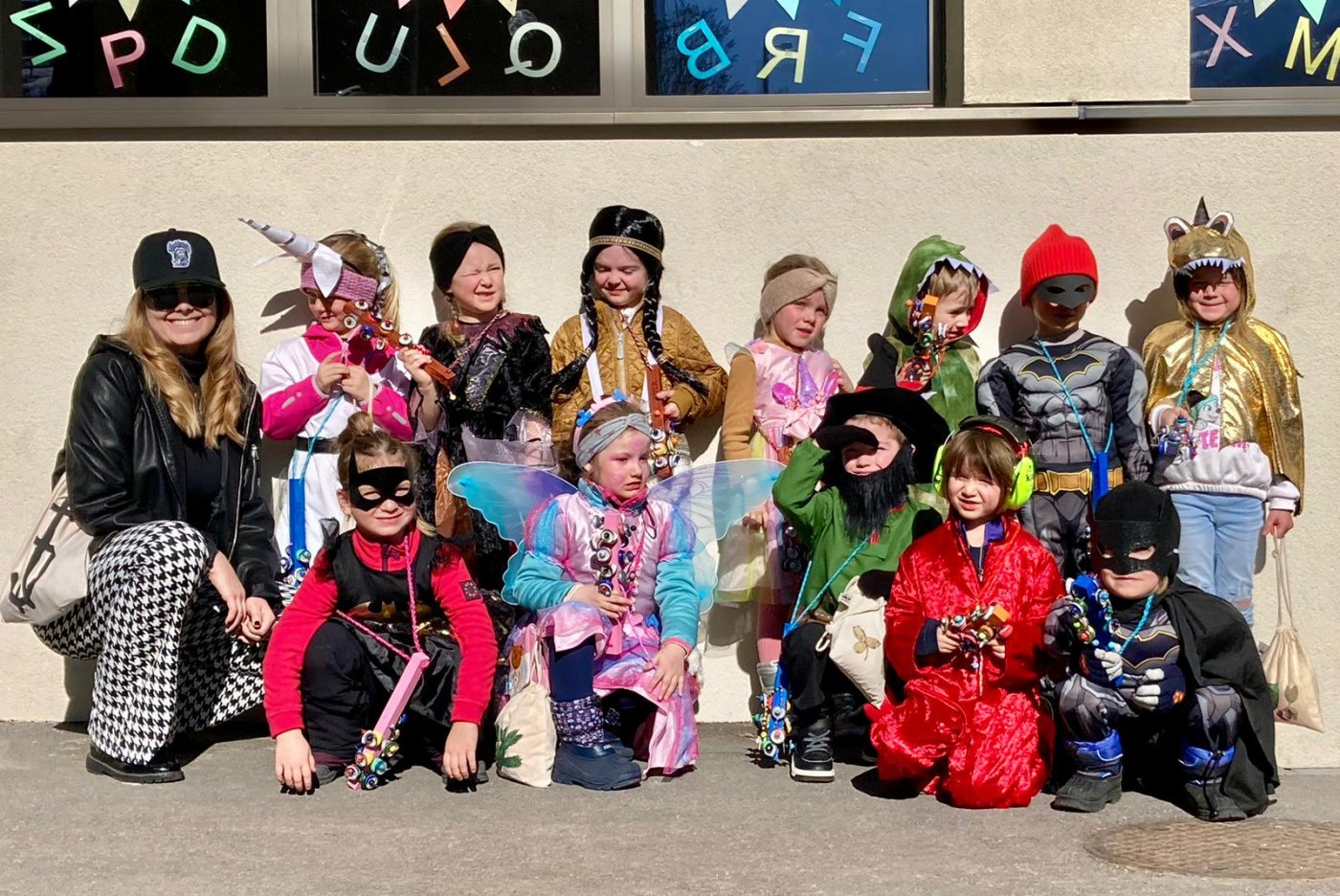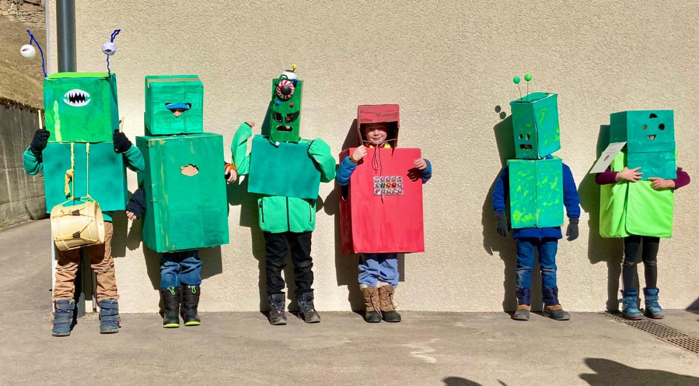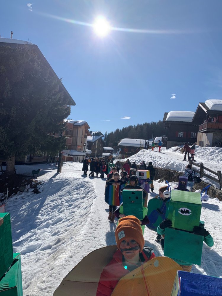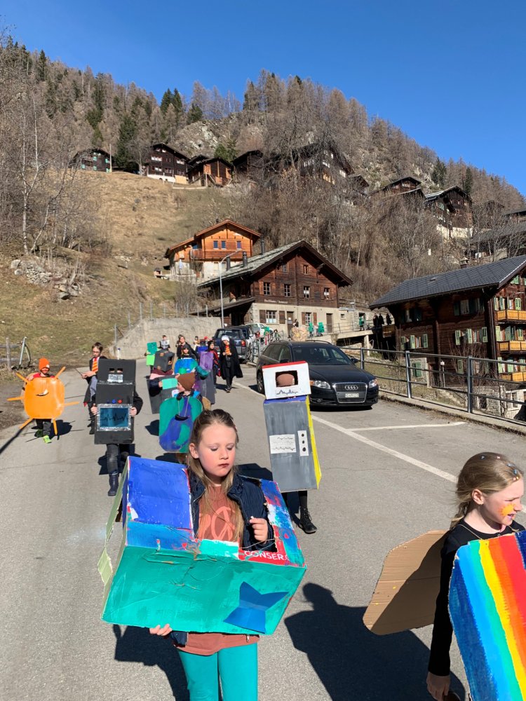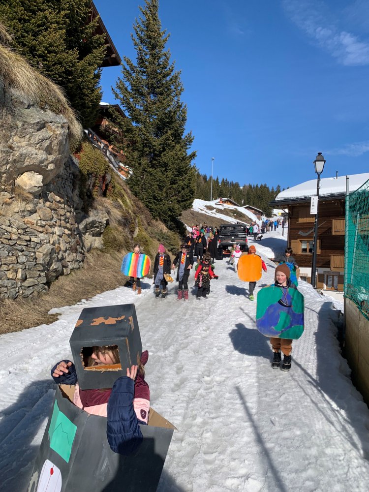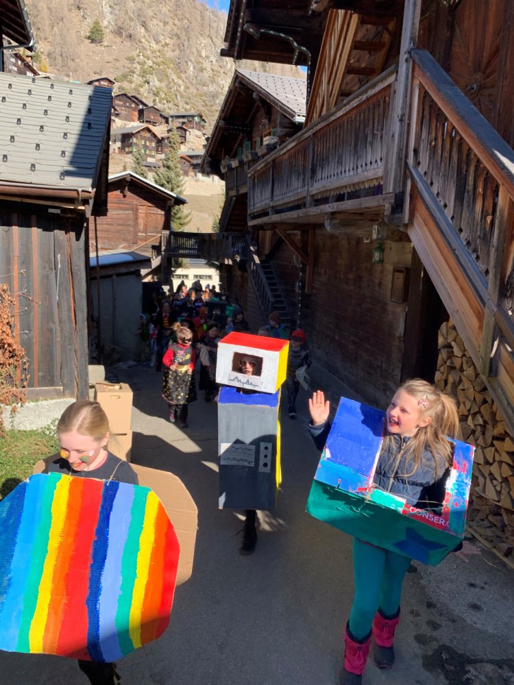 Am Donnerstagnachmittag versammelten sich die rund fünfundvierzig "Maschgini" mit den prächtigsten und lustigsten Kostümen auf dem Schulhausplatz. Nach einem kurzen Dorfrundgang in Betten - begleitet mit passender Musik und Effektinstrumenten – ging die Tour auf der Bettmeralp weiter. Anschliessend trafen sich die Maschgini und die Zuschauer/innen im Dancing zu einem gemütlichen Beisammensein. Am Abend schlenderten dann die kleinen Fasnächtler/innen fröhlich und vergnügt nach Hause.