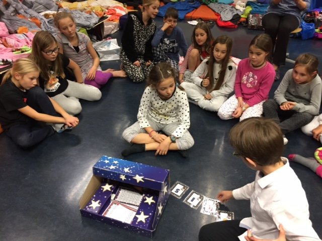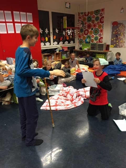 Nach einer Mutprobe und einer Foto-Schnitzeljagd, durften die SuS noch ihre selbst inszenierten Theater, Sketsche, Zaubereien und Mutproben vorführen. Wer noch fit war, durfte im Schlafsack mit Taschenlampe bis zum Einschlafen lesen.