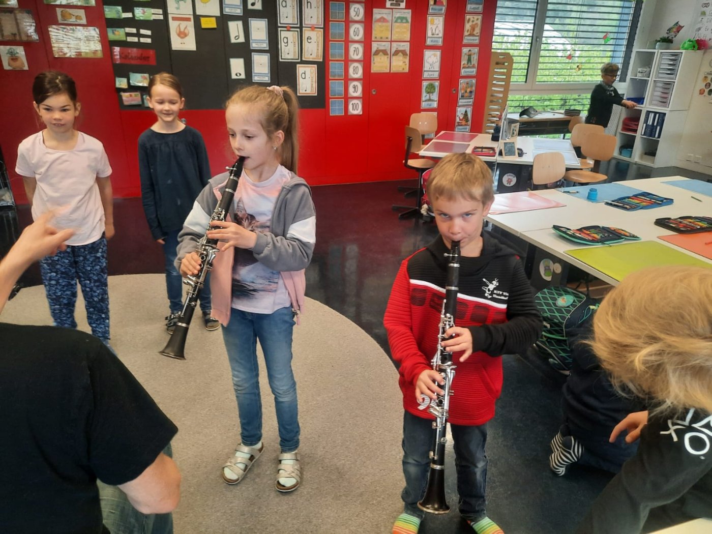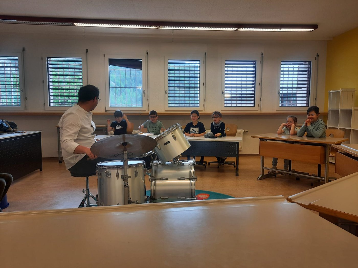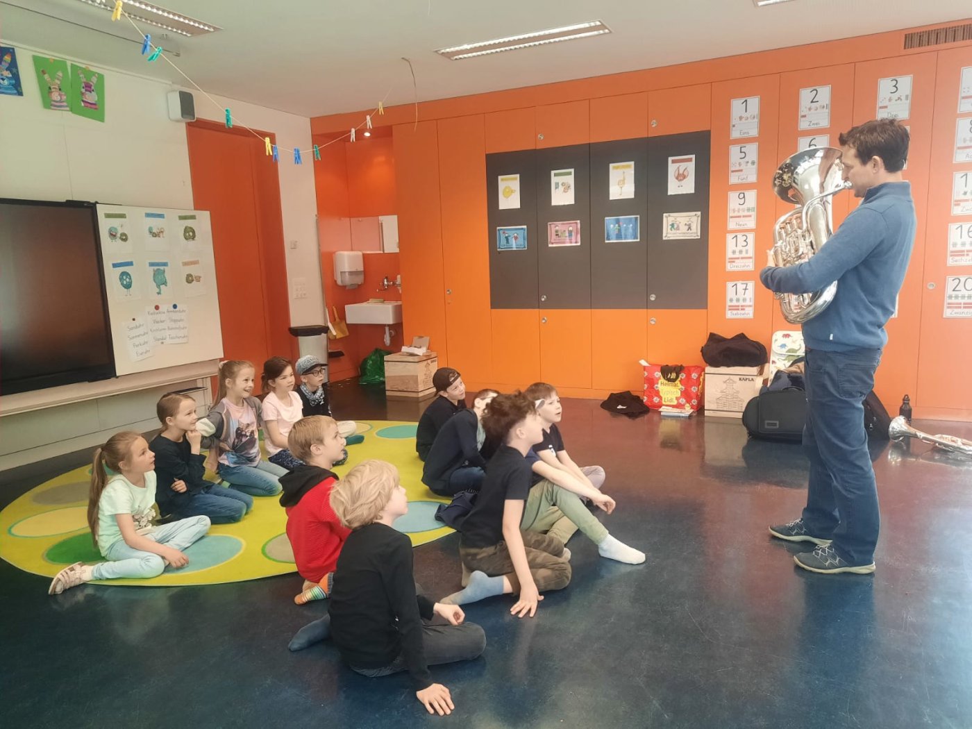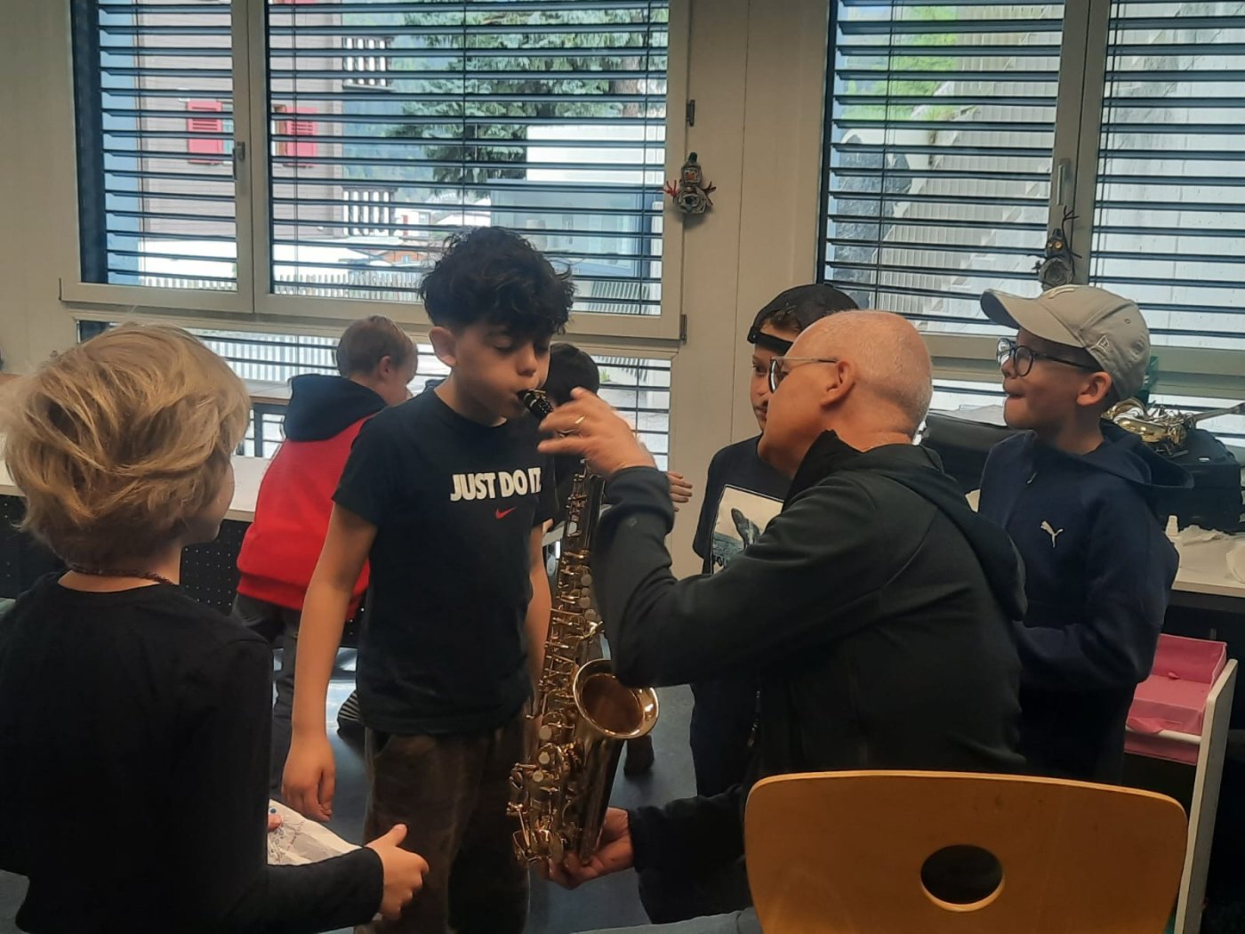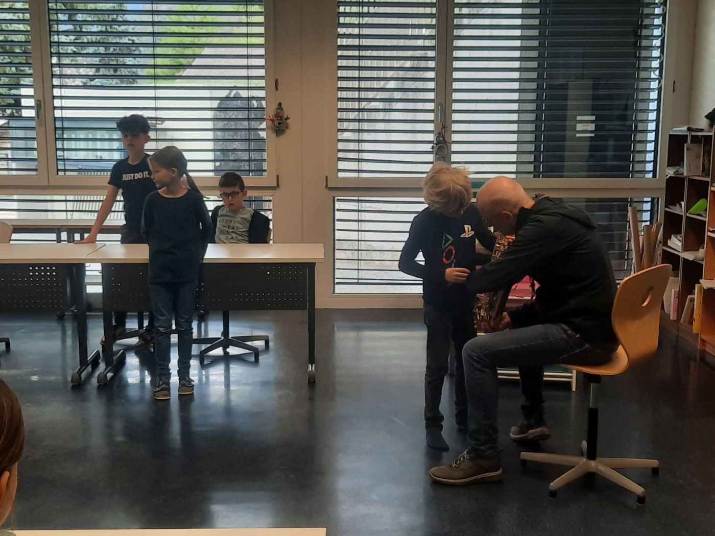 Heute Morgen besuchten uns mehrere Experten der AMO (allgemeine Musikschule Oberwallis). Die begeisterten Musikantinnen und Musikanten haben diverse Instrumente mitgebracht und die Schülerinnen und Schüler der Primarschule Bitsch durften selbst probieren, den Blas- und Schlaginstrumenten Klänge zu entlocken. Die Kinder waren sehr engagiert und haben die Instrumente mit viel Freude ausgetestet. Die Experten erläuterten den Kindern ausserdem noch gezielt ihr Fachwissen zu den Instrumenten. Das ein Schlagzeug zirka im Jahre 1887 entstanden ist oder dass man mit einem Euphonium sowohl schnelle als auch langsame, sowie hohe und tiefe Töne spielen kann. Ausserdem gab es für Gross und Klein die eine oder andere Hörprobe. Vielleicht finden sich ja einzelne Kinder demnächst in einer Musikgesellschaft wieder. Eventuell sogar im Jugendensemble MG «Massa Bitsch».