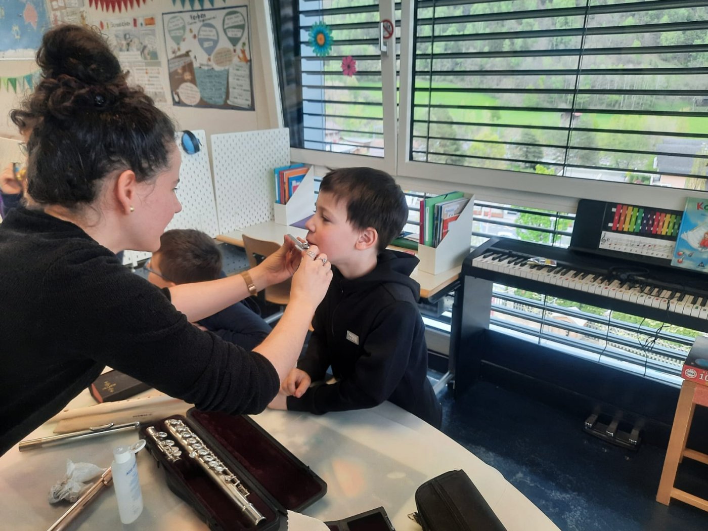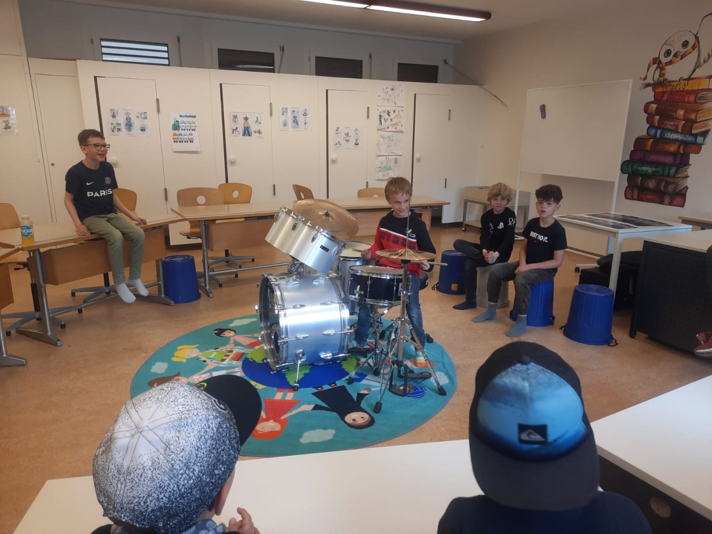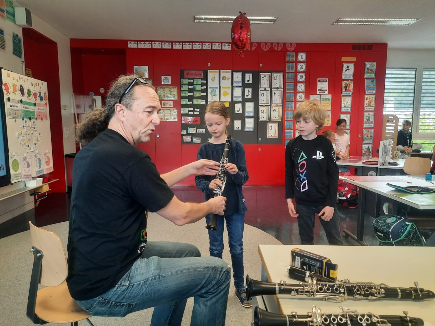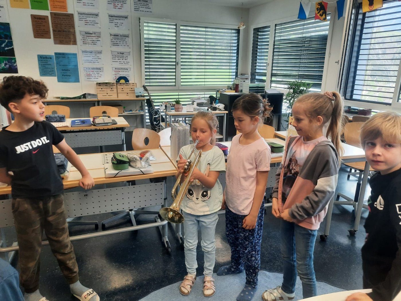 Heute Morgen besuchten uns mehrere Experten der AMO (allgemeine Musikschule Oberwallis). Die begeisterten Musikantinnen und Musikanten haben diverse Instrumente mitgebracht und die Schülerinnen und Schüler der Primarschule Bitsch durften selbst probieren, den Blas- und Schlaginstrumenten Klänge zu entlocken. Die Kinder waren sehr engagiert und haben die Instrumente mit viel Freude ausgetestet. Die Experten erläuterten den Kindern ausserdem noch gezielt ihr Fachwissen zu den Instrumenten. Das ein Schlagzeug zirka im Jahre 1887 entstanden ist oder dass man mit einem Euphonium sowohl schnelle als auch langsame, sowie hohe und tiefe Töne spielen kann. Ausserdem gab es für Gross und Klein die eine oder andere Hörprobe. Vielleicht finden sich ja einzelne Kinder demnächst in einer Musikgesellschaft wieder. Eventuell sogar im Jugendensemble MG «Massa Bitsch».