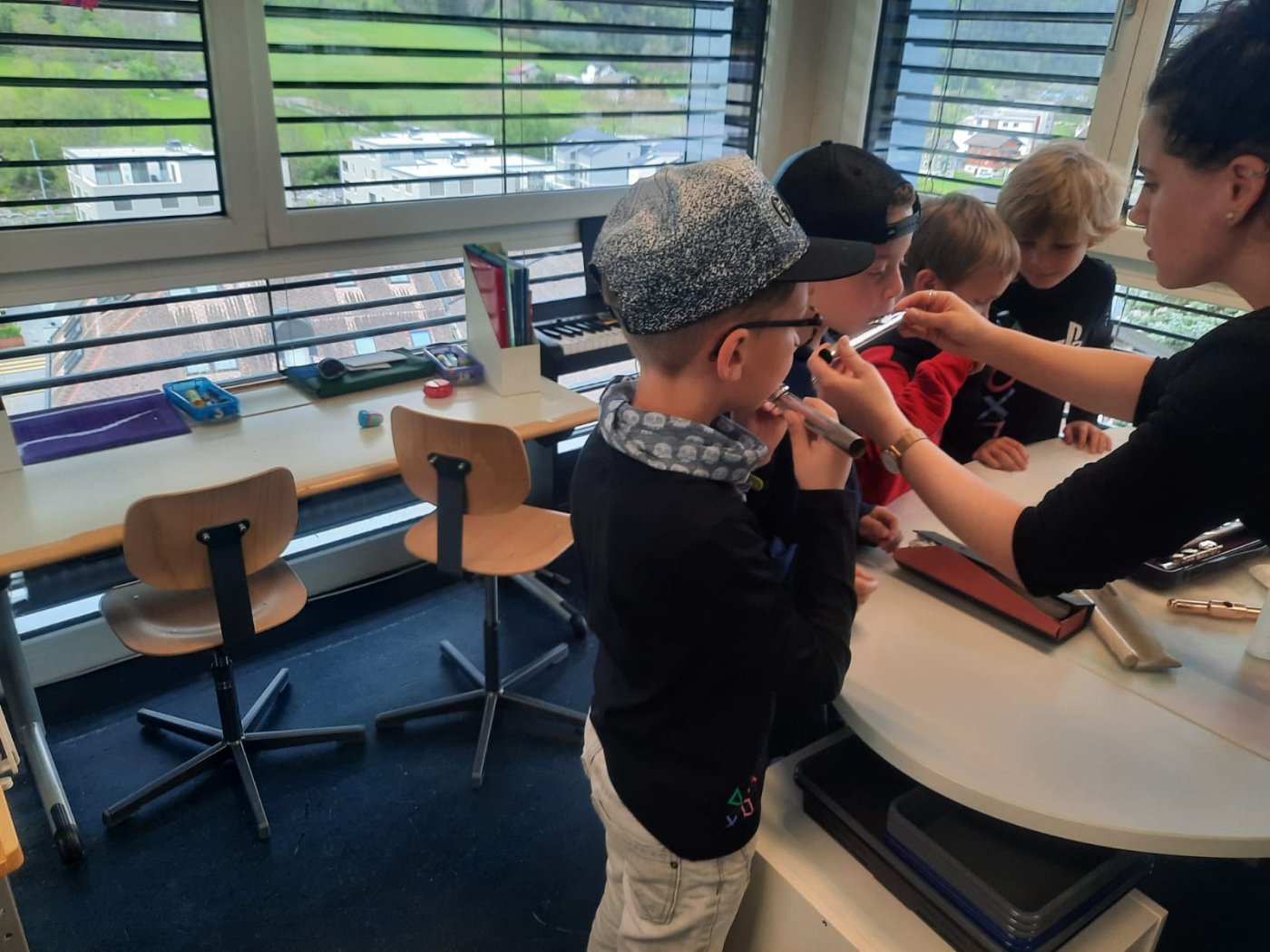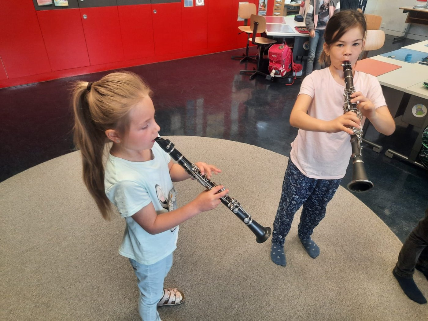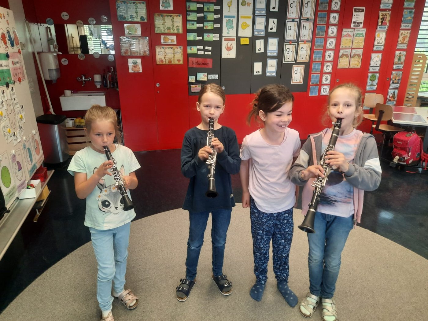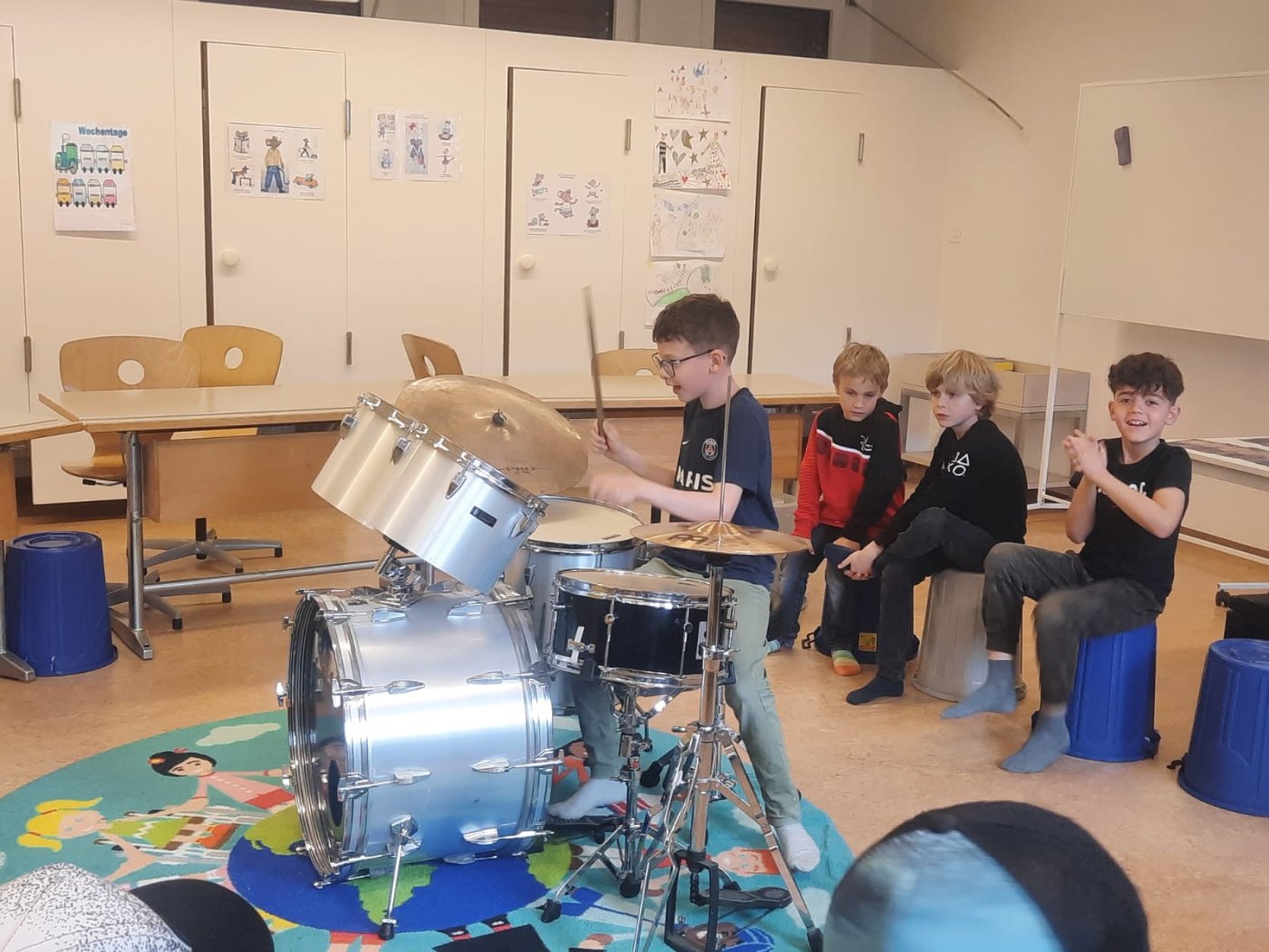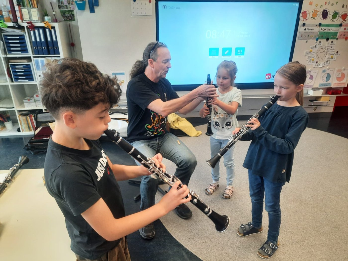 Heute Morgen besuchten uns mehrere Experten der AMO (allgemeine Musikschule Oberwallis). Die begeisterten Musikantinnen und Musikanten haben diverse Instrumente mitgebracht und die Schülerinnen und Schüler der Primarschule Bitsch durften selbst probieren, den Blas- und Schlaginstrumenten Klänge zu entlocken. Die Kinder waren sehr engagiert und haben die Instrumente mit viel Freude ausgetestet. Die Experten erläuterten den Kindern ausserdem noch gezielt ihr Fachwissen zu den Instrumenten. Das ein Schlagzeug zirka im Jahre 1887 entstanden ist oder dass man mit einem Euphonium sowohl schnelle als auch langsame, sowie hohe und tiefe Töne spielen kann. Ausserdem gab es für Gross und Klein die eine oder andere Hörprobe. Vielleicht finden sich ja einzelne Kinder demnächst in einer Musikgesellschaft wieder. Eventuell sogar im Jugendensemble MG «Massa Bitsch».