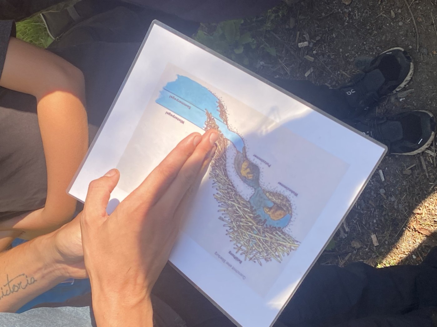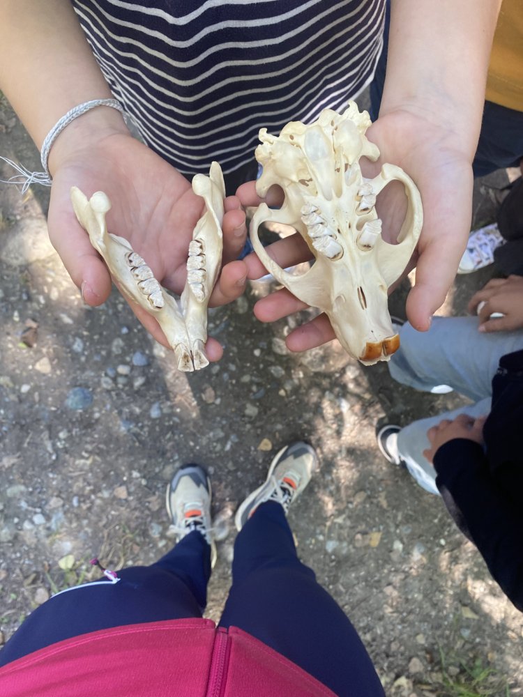 Beim ersten Posten haben wir den Biber-Schädel kennengelernt. Die Zähne waren sehr gelb und das Fell war sehr weich. Anschliessend gingen wir noch in den eiskalten Bach, um unsere Füsse zu baden. Beim zweiten Posten lernten wir den Biberschwanz und die Biberpfoten und Abdrücke kennen. Anschliessend gingen wir Biberspuren suchen. Der Biberschwanz ist ca. 20cm lang. Die Biberpfoten sind ca. so gross wie eine menschliche Hand. Am Schluss waren wir noch beim dritten Posten, dort haben wir den Geruch namens Bibergeil kennengelernt. Bibergeil spritzt der Biber an einen Baum, um sein Revier zu markieren. Wir mussten auch einen eigenen Duft aus Blumen, Beeren usw. gemacht.