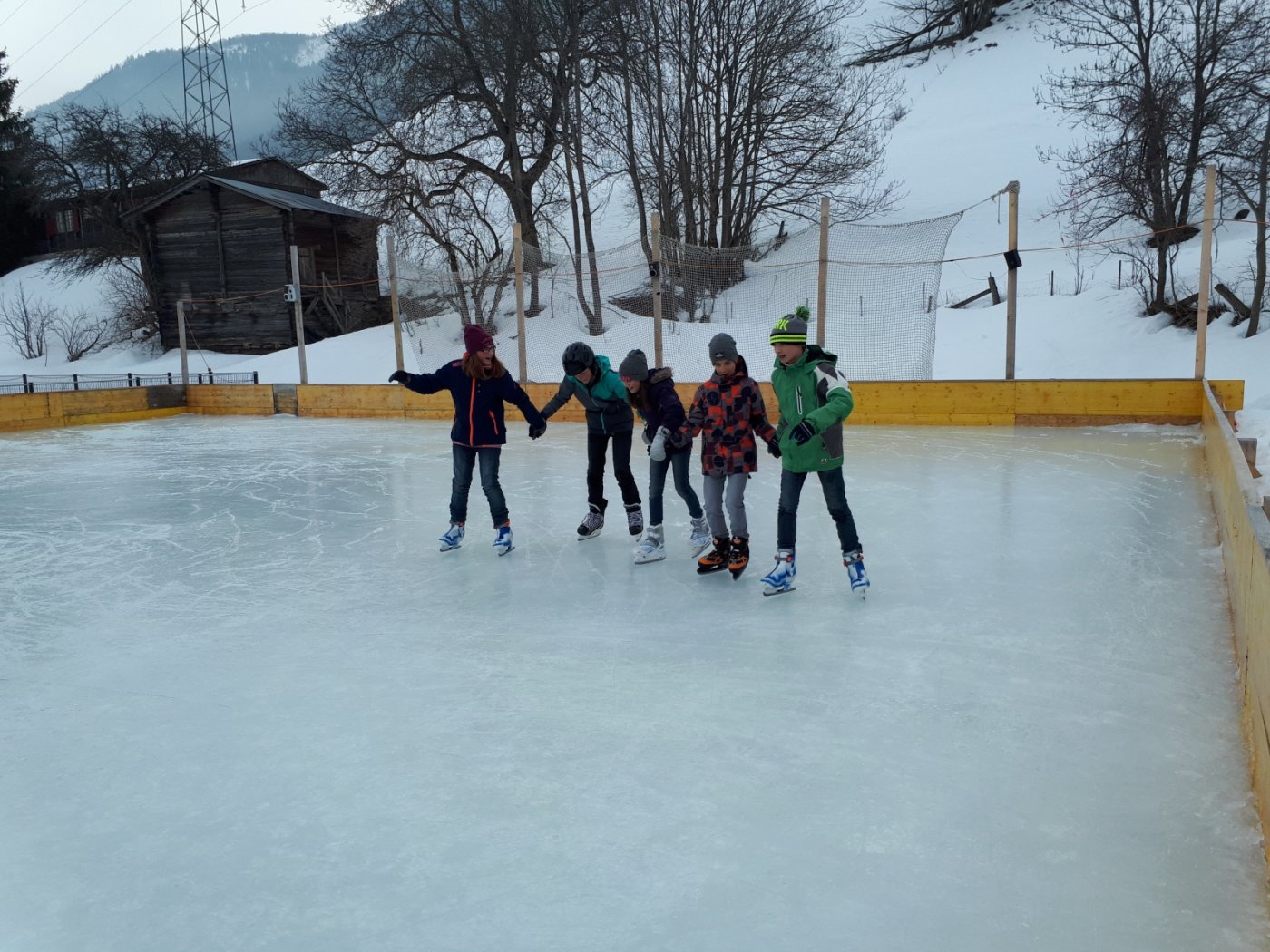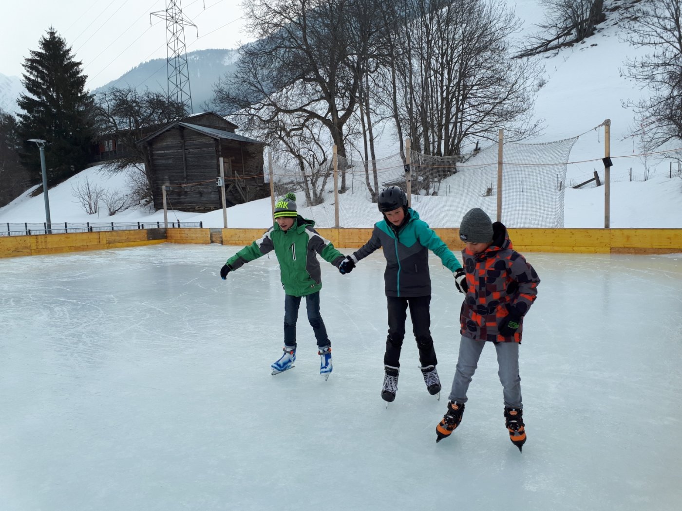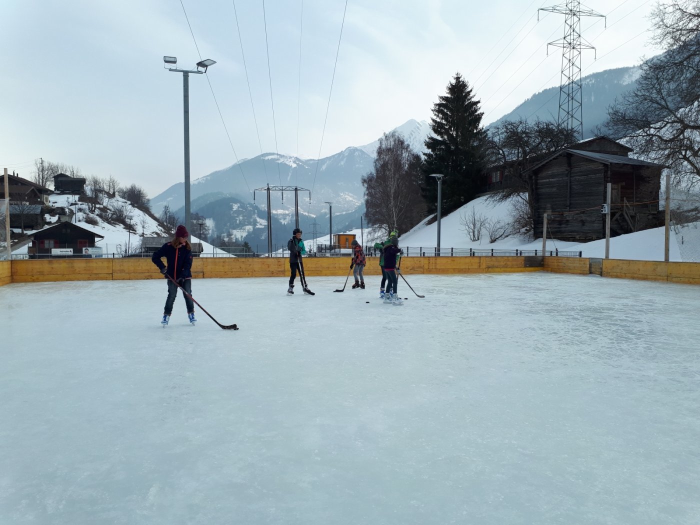 Am Freitag vor den Ferien gingen wir, die 6-8H Grengiols, auf die Natureisbahn. Nach der Schulmesse liefen wir hinauf zur Eisabahn. Wir zogen die Schlittschuhe an und danach ging es auch schon direkt auf's rutschige Eis. Wir fuhren eine Weile Slalom und machten verschiedene Spiele wie zum Beispiel Fangis. Als die erste Lektion um war, machten wir eine Pause und bekamen von Frau Imesch ein Branchli, ein Weggli und einen frischen Orangensaft. Danach durften wir Ice-Hockey spielen. Zum Schluss konnten wir selber Spiele aussuchen. Als die zwei Lektionen um waren, gingen wir noch bis um Mittag in die Schule. Es war sehr cool!