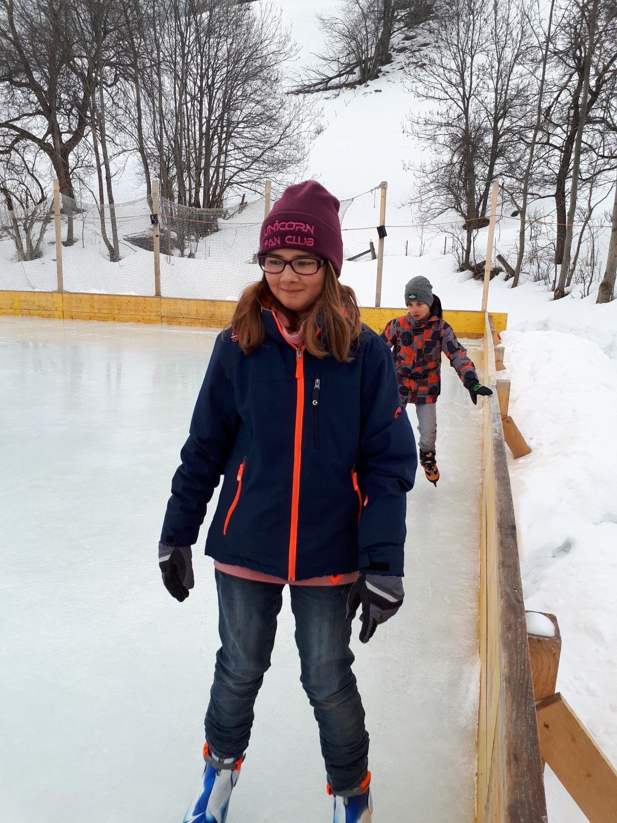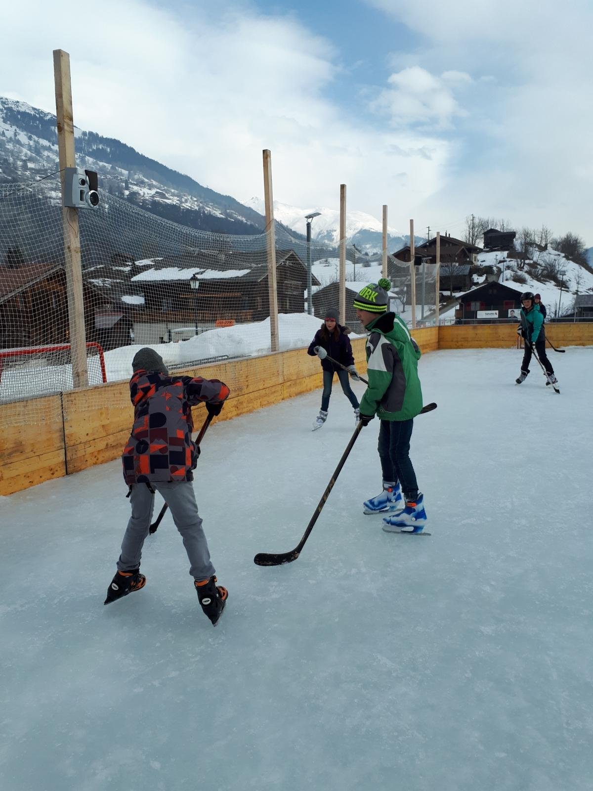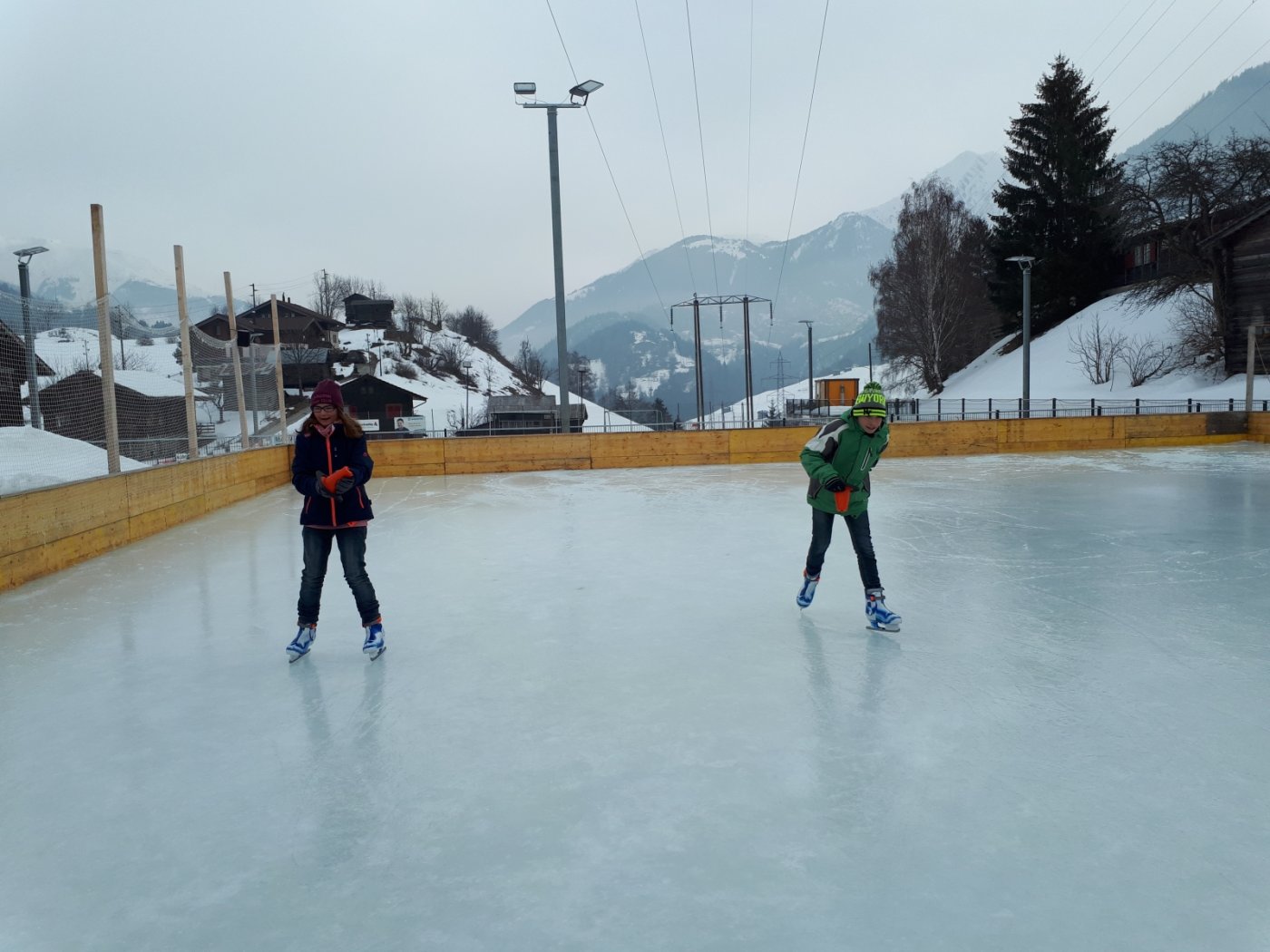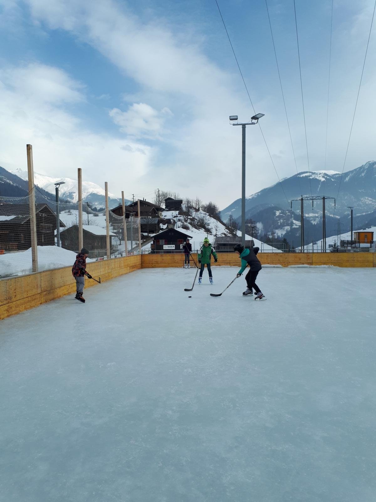 Am Freitag vor den Ferien gingen wir, die 6-8H Grengiols, auf die Natureisbahn. Nach der Schulmesse liefen wir hinauf zur Eisabahn. Wir zogen die Schlittschuhe an und danach ging es auch schon direkt auf's rutschige Eis. Wir fuhren eine Weile Slalom und machten verschiedene Spiele wie zum Beispiel Fangis. Als die erste Lektion um war, machten wir eine Pause und bekamen von Frau Imesch ein Branchli, ein Weggli und einen frischen Orangensaft. Danach durften wir Ice-Hockey spielen. Zum Schluss konnten wir selber Spiele aussuchen. Als die zwei Lektionen um waren, gingen wir noch bis um Mittag in die Schule. Es war sehr cool!