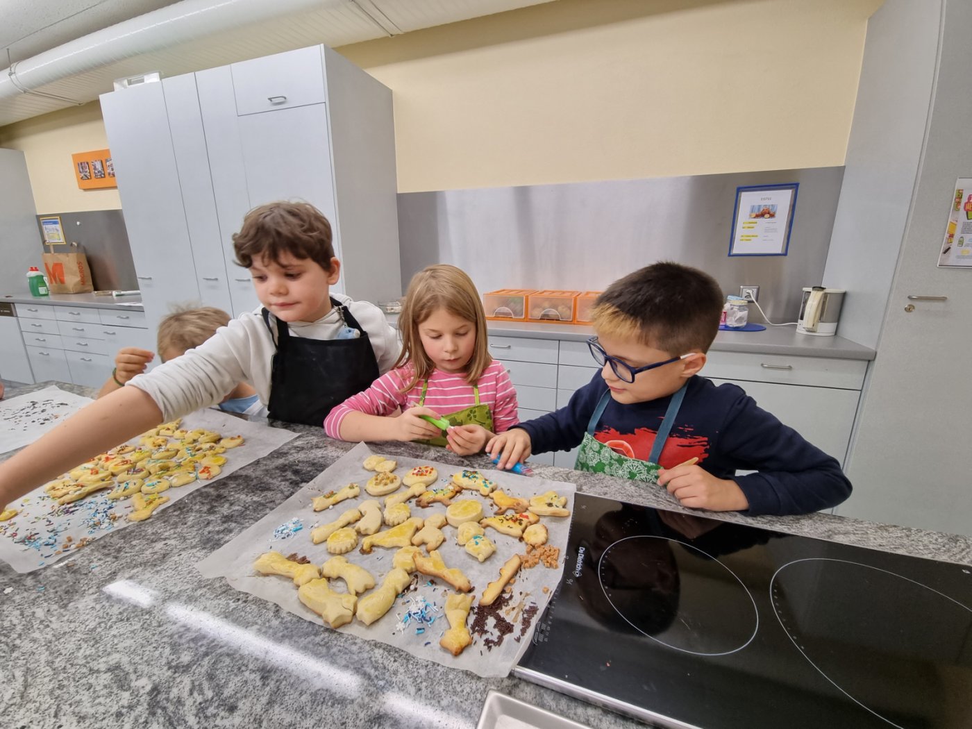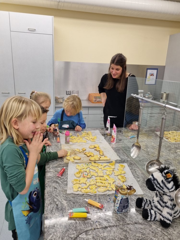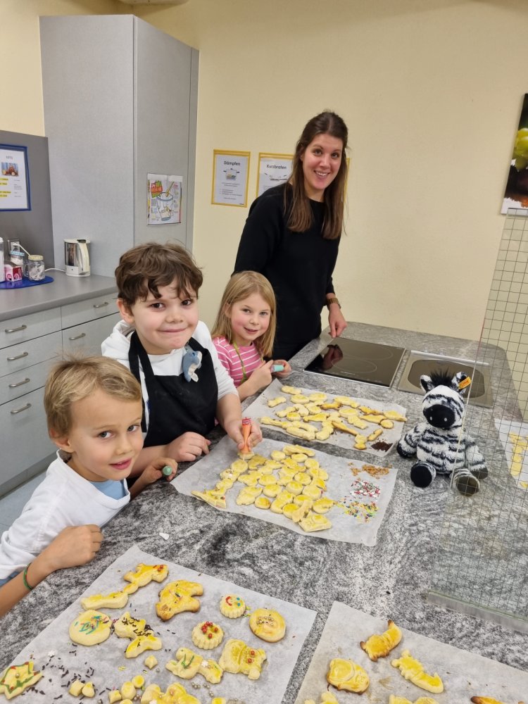 Am vergangenen Freitag war es dann so weit. Elena hatte selbstgemachten Mailänderteig mitgebracht. Mit angezogener Küchenschürze ging es ans Backen der Mailänderli. Auswallen, ausstechen, anfärben und verzieren stand auf dem Programm. Zwischendurch wurde der Teig oder ein bereits fertiges Biskuit genüsslich probiert. Auch das Lied «In der Weihnachtsbäckerei» wurde immer mal wieder angestimmt. Zum Schluss konnte jedes Kind einen Sack voller Mailänderli mit nach Hause nehmen.