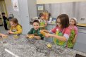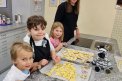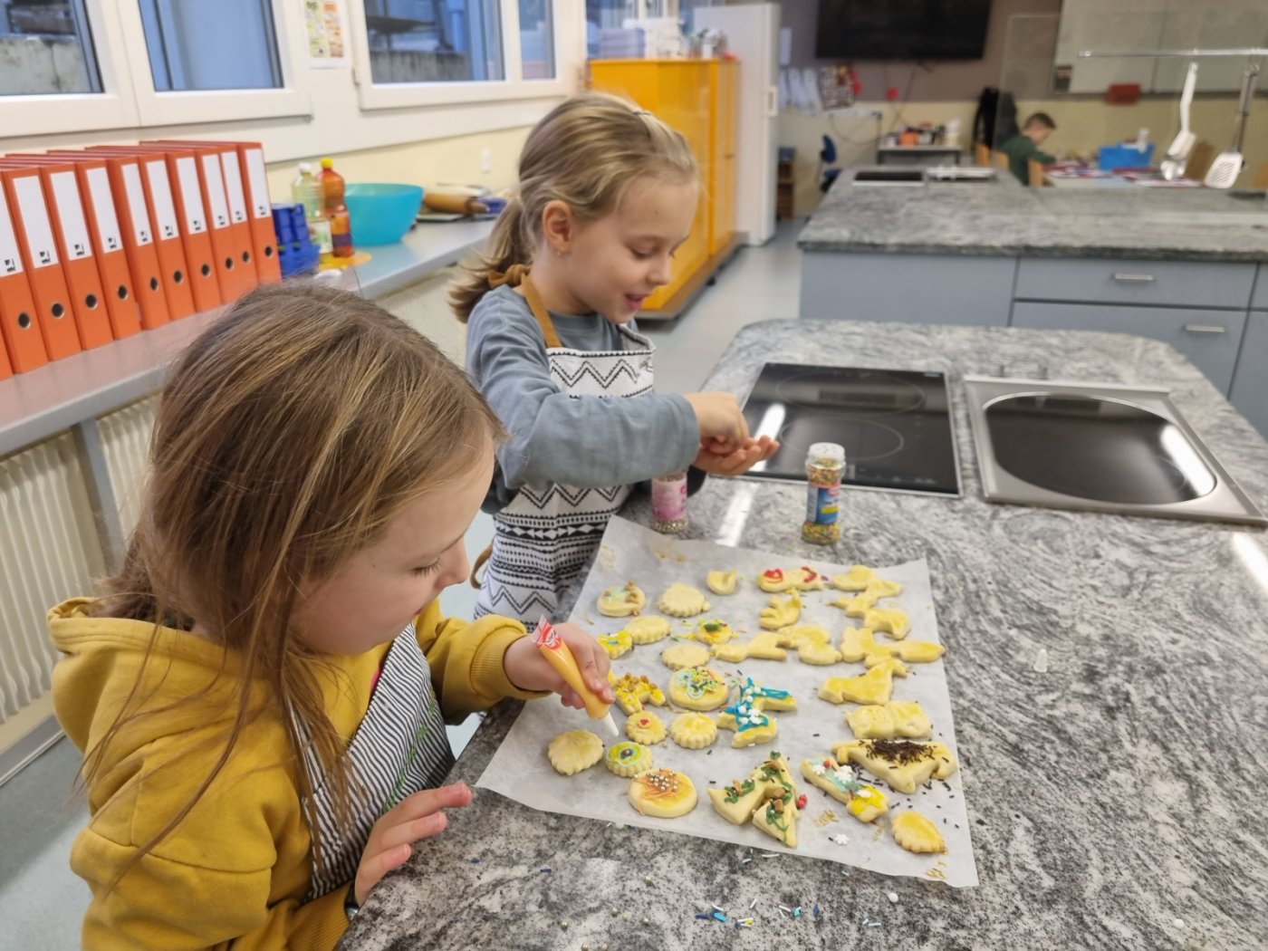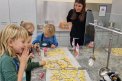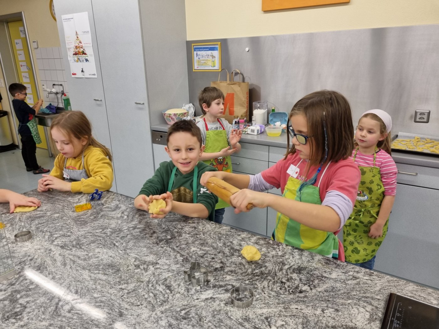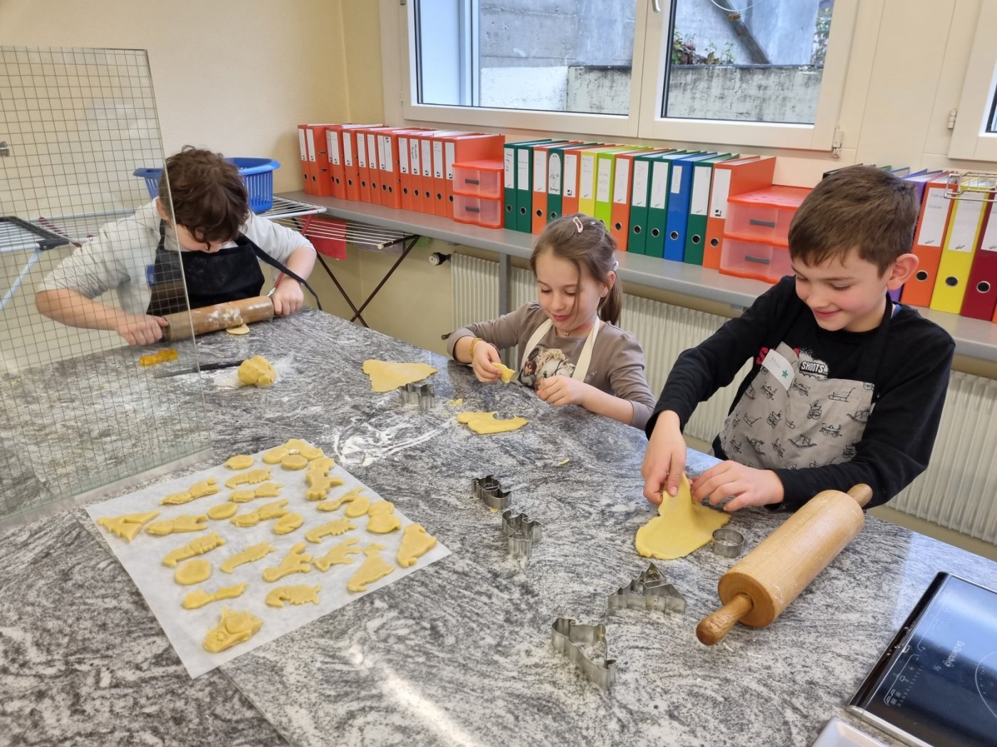 Am vergangenen Freitag war es dann so weit. Elena hatte selbstgemachten Mailänderteig mitgebracht. Mit angezogener Küchenschürze ging es ans Backen der Mailänderli. Auswallen, ausstechen, anfärben und verzieren stand auf dem Programm. Zwischendurch wurde der Teig oder ein bereits fertiges Biskuit genüsslich probiert. Auch das Lied «In der Weihnachtsbäckerei» wurde immer mal wieder angestimmt. Zum Schluss konnte jedes Kind einen Sack voller Mailänderli mit nach Hause nehmen.