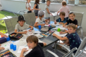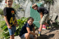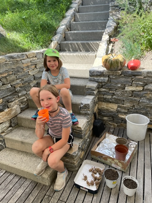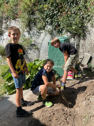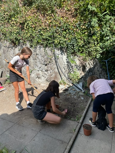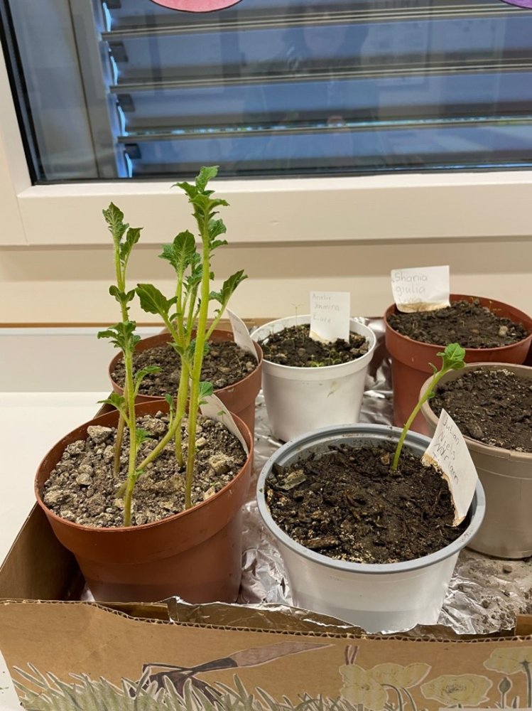 Also sind wir mit Gartenutensilien ausgerüstet in den Garten. Während eine Gruppe die Saatkartoffeln in Töpfe gepflanzt hat, waren die restlichen Schüler mit Malen und Schreiben beschäftigt.