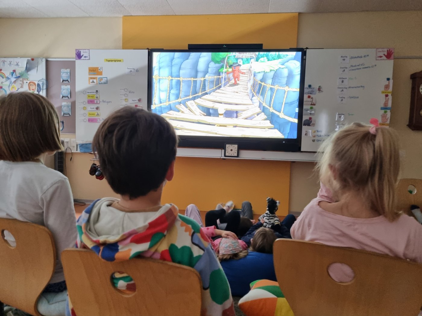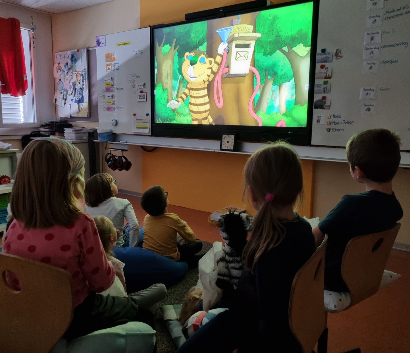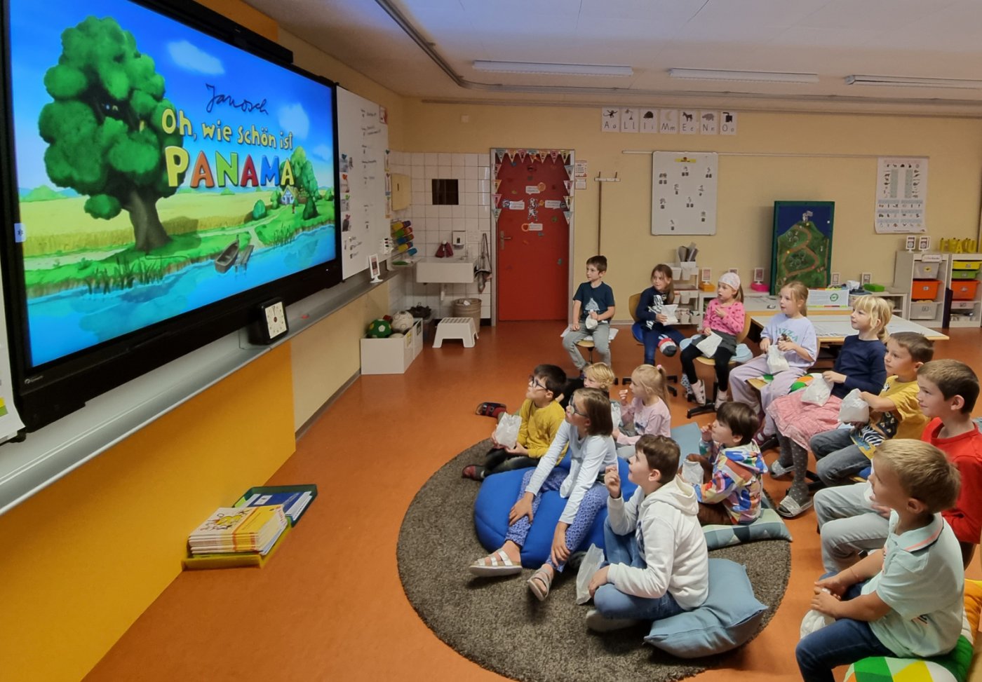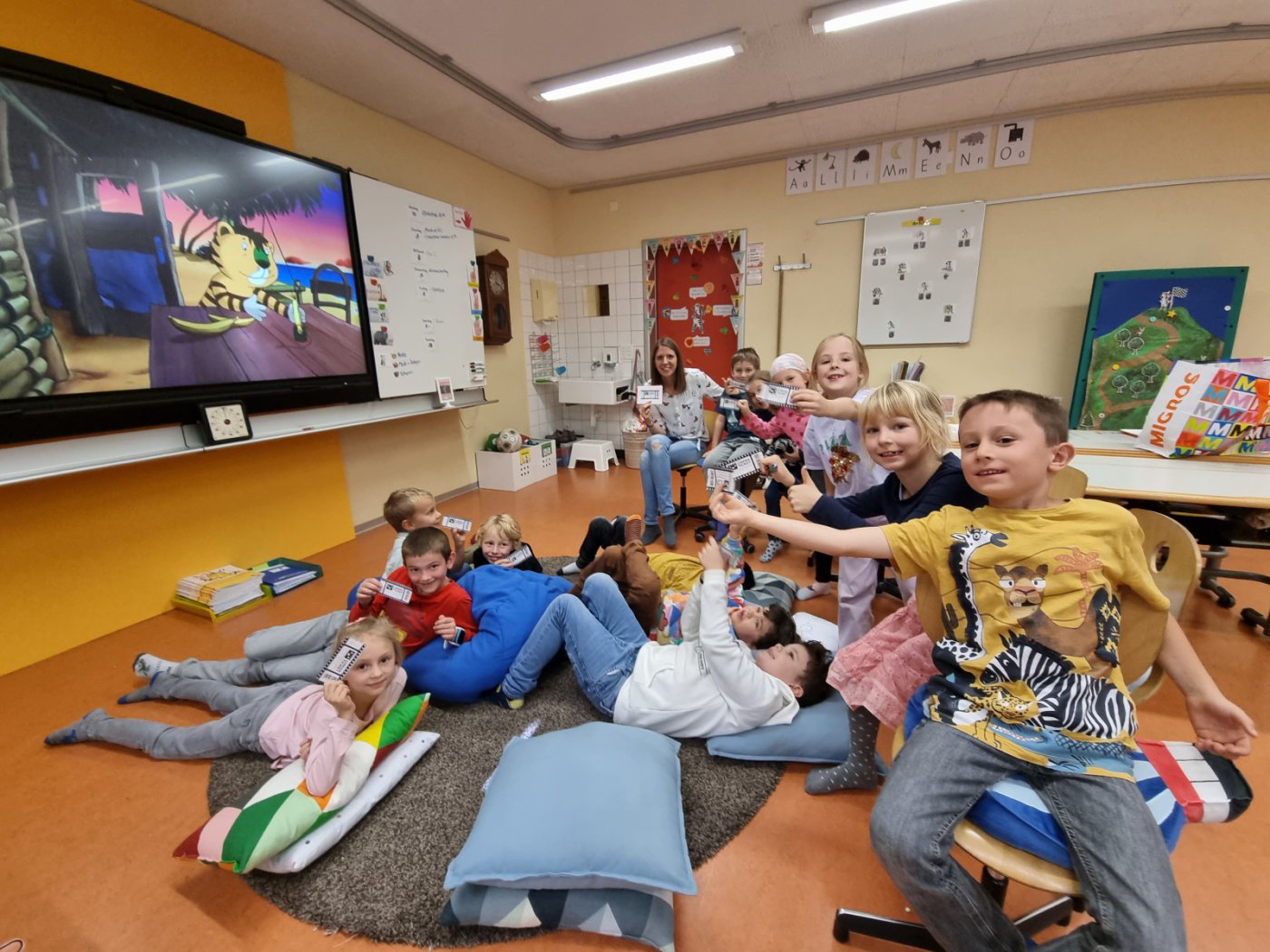 Wir hatten endlich genügend Klassensterne gesammelt. Als Belohnung gab es einen Kinonachmittag. «Oh wie schön ist Panama» hiess der Film. Popcorn und Ice-Tea durften natürlich nicht fehlen. Es war wie in einem richtigen Kino.