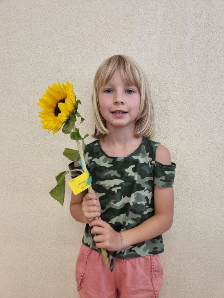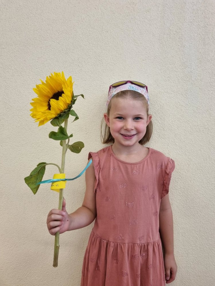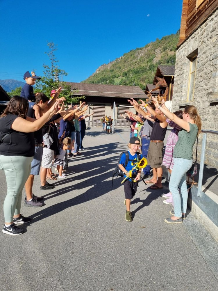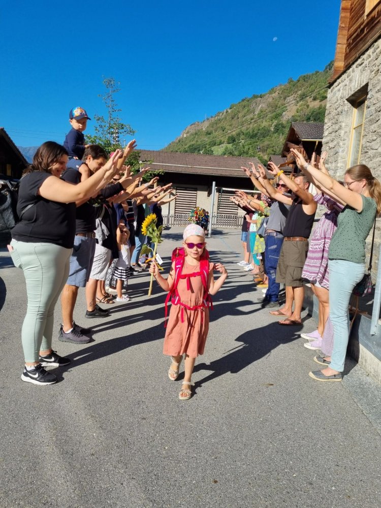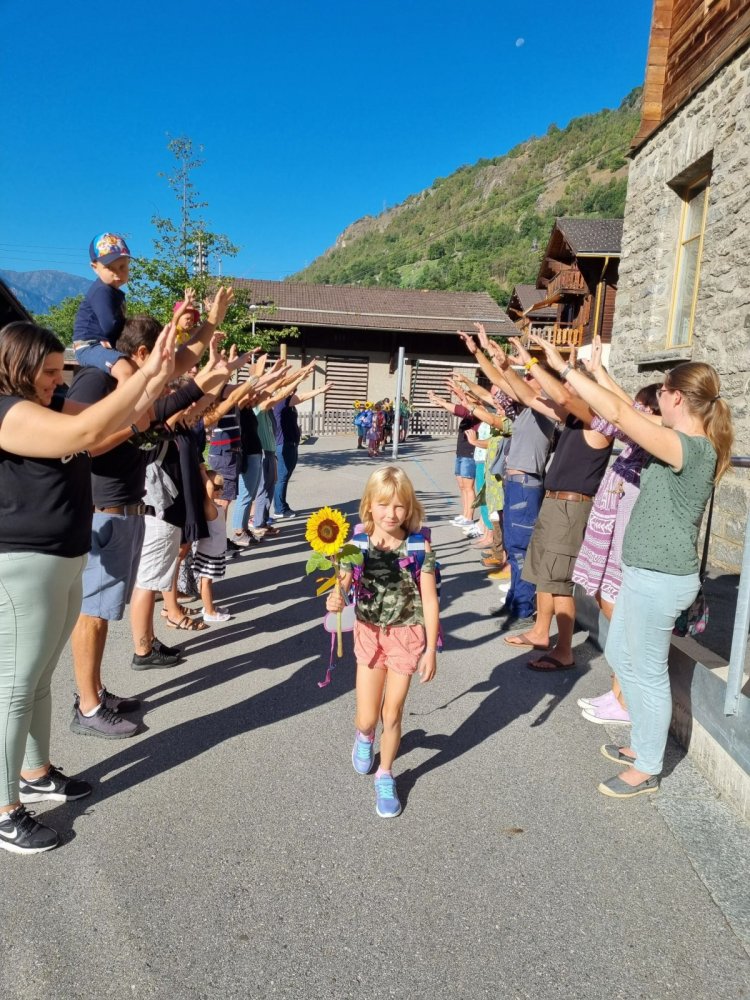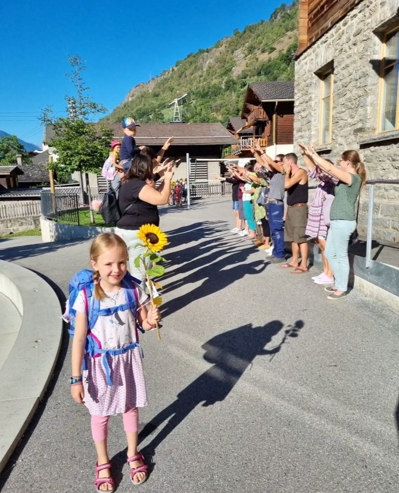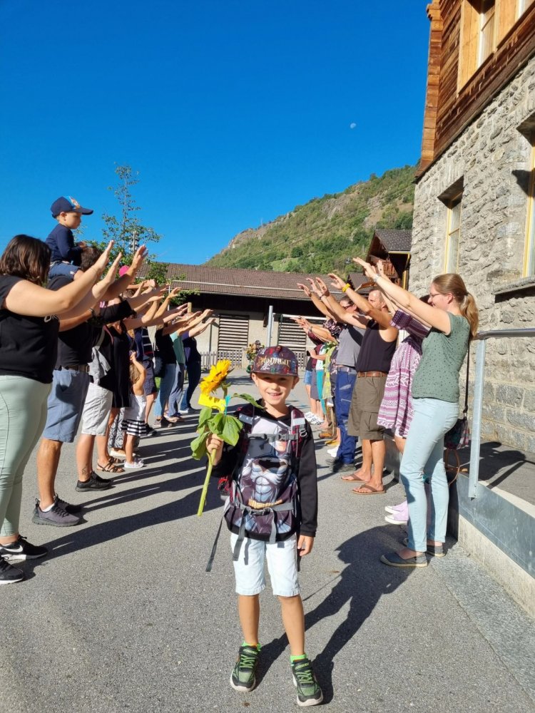 Unsere Lehrerin Sabrina und das Zebra Franz haben auf dem Pausenplatz auf uns gewartet. Wir waren alle sehr nervös. Sabrina hat uns aber sehr lieb begrüsst. Sie hatte sogar Sonnenblumen dabei. Mama und Papa haben einen Gruss oder einen Wunsch auf einen Zettel geschrieben. Dieser wurde an der Sonnenblume angemacht. Sabrina hat dann jedem eine Sonnenblume geschenkt. Durch den Tunell voller Hände zu laufen hat grossen Spass gemacht! Mama und Papa gingen dann nach Hause und wir durften in die Schule. Was für ein tolles Klassenzimmer – es gefiel uns sehr! Und wir bekamen sogar Hausaufgaben – darüber haben wir uns sehr gefreut.
