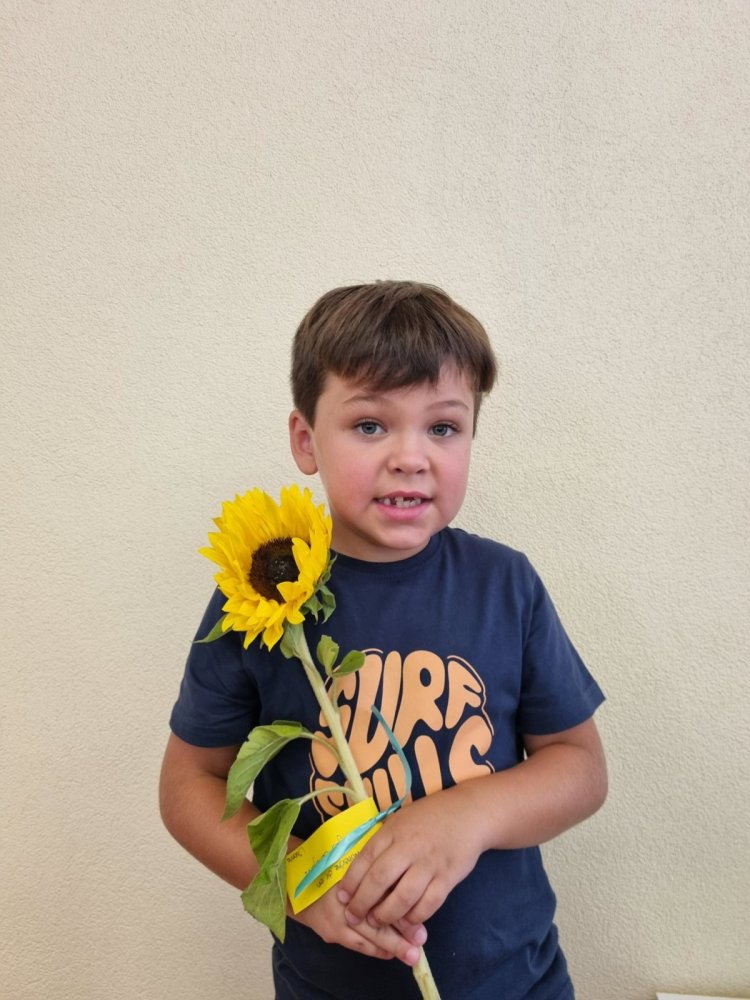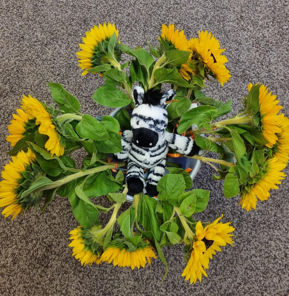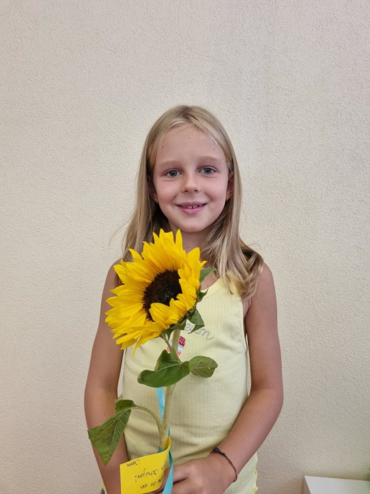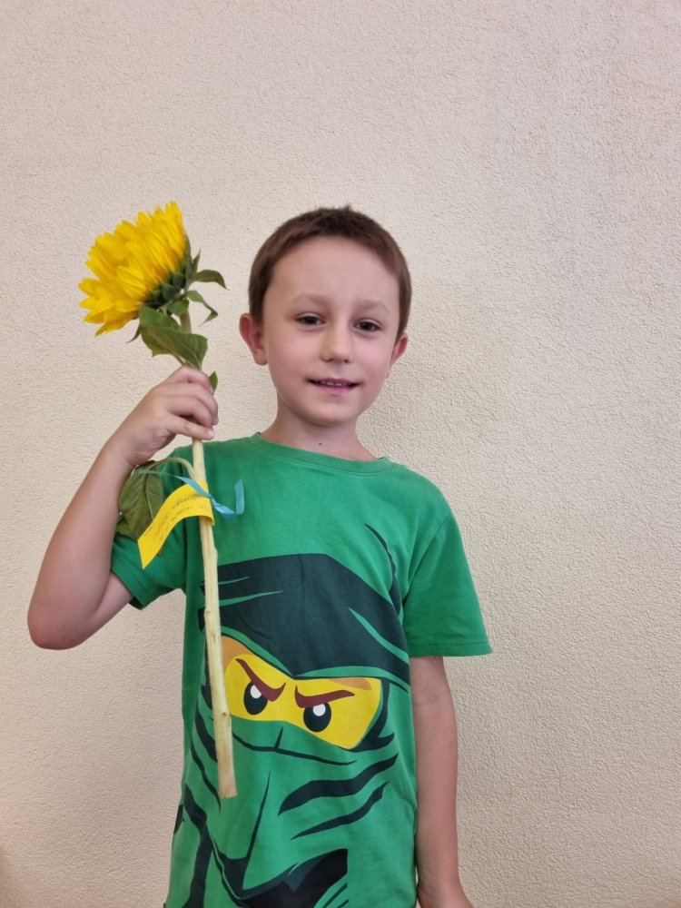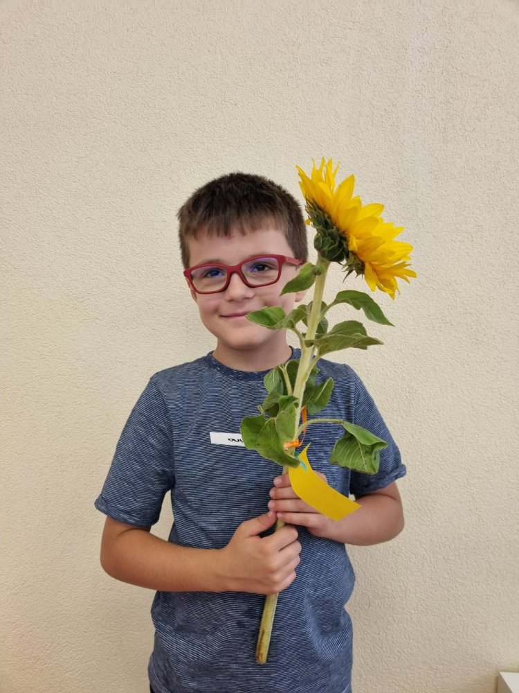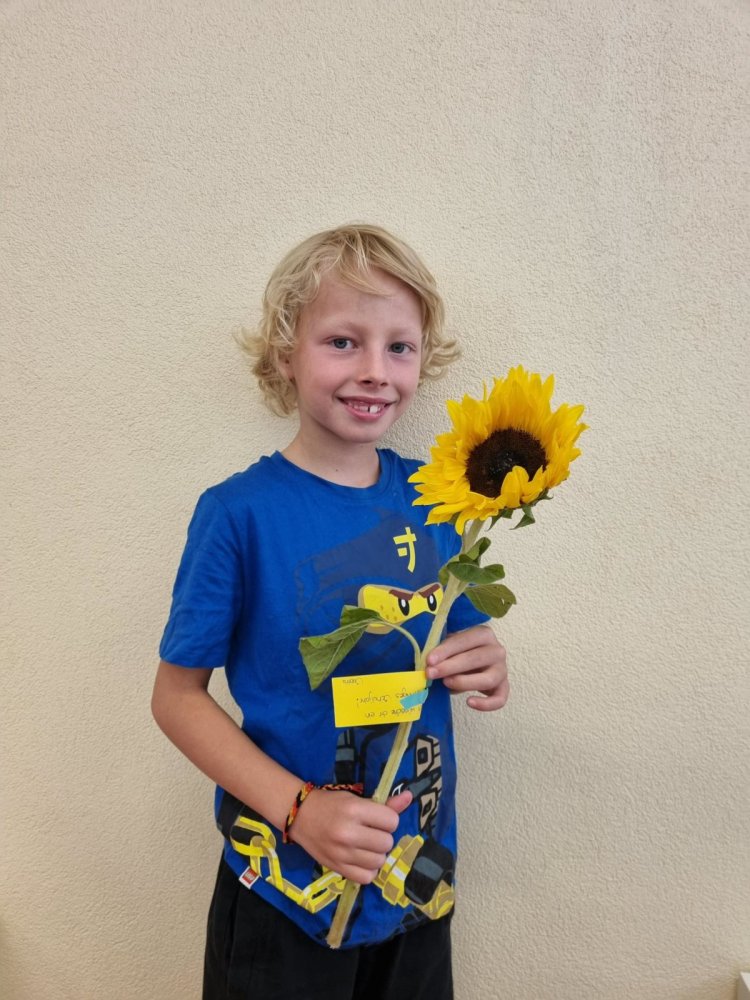 Unsere Lehrerin Sabrina und das Zebra Franz haben auf dem Pausenplatz auf uns gewartet. Wir waren alle sehr nervös. Sabrina hat uns aber sehr lieb begrüsst. Sie hatte sogar Sonnenblumen dabei. Mama und Papa haben einen Gruss oder einen Wunsch auf einen Zettel geschrieben. Dieser wurde an der Sonnenblume angemacht. Sabrina hat dann jedem eine Sonnenblume geschenkt. Durch den Tunell voller Hände zu laufen hat grossen Spass gemacht! Mama und Papa gingen dann nach Hause und wir durften in die Schule. Was für ein tolles Klassenzimmer – es gefiel uns sehr! Und wir bekamen sogar Hausaufgaben – darüber haben wir uns sehr gefreut.